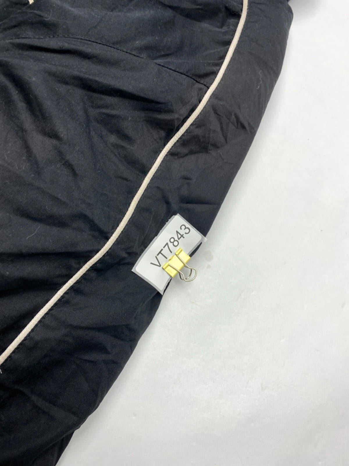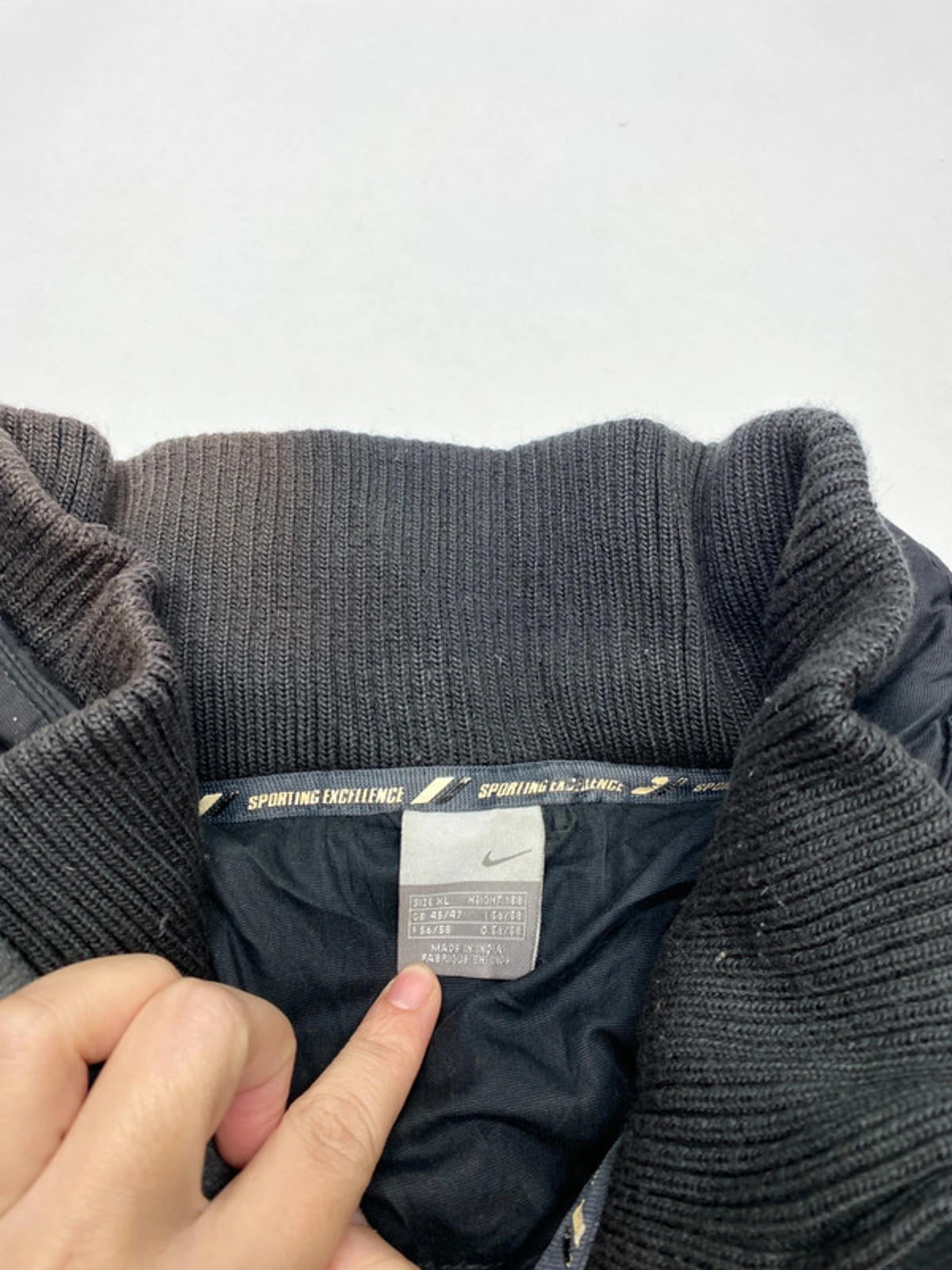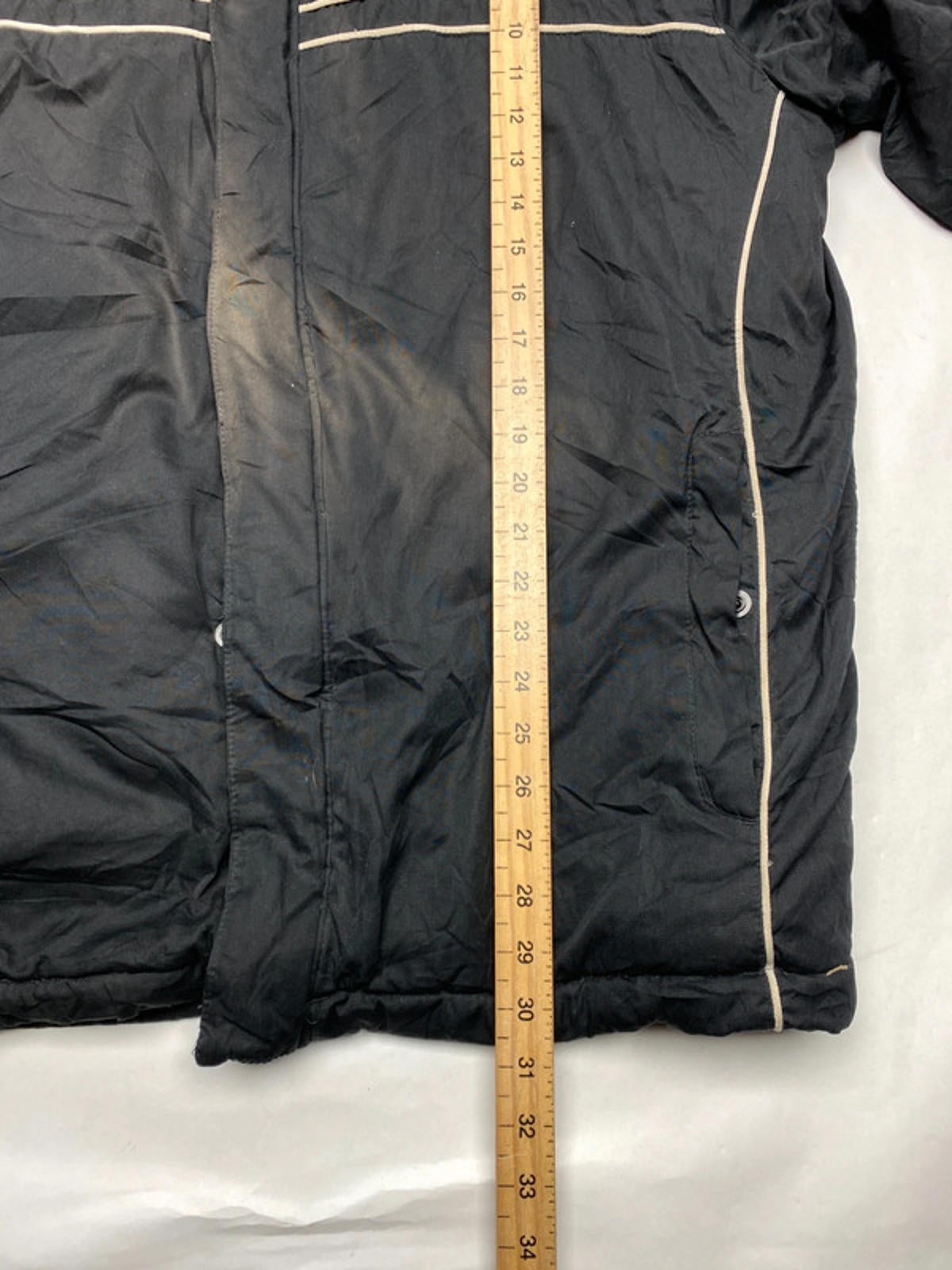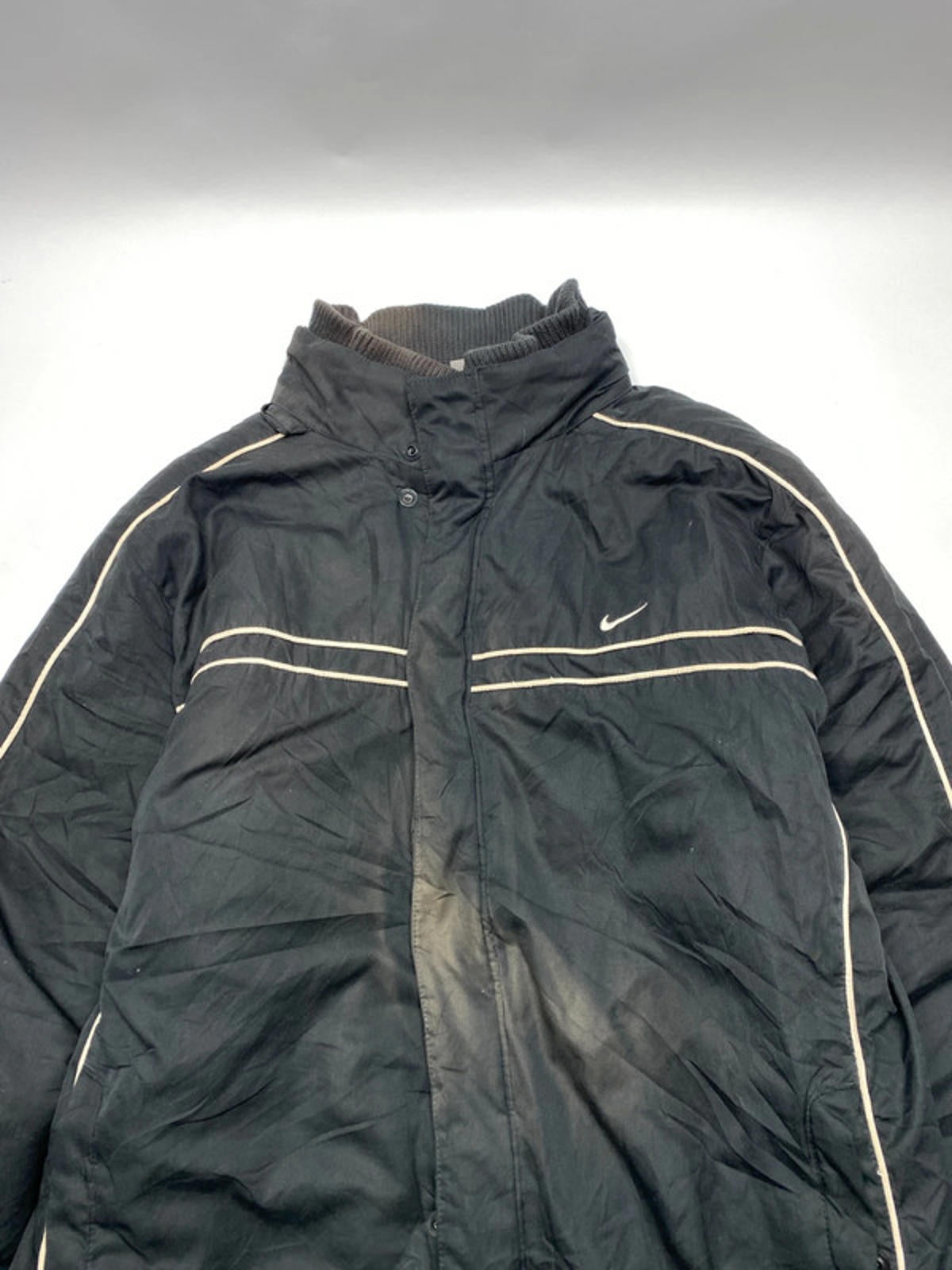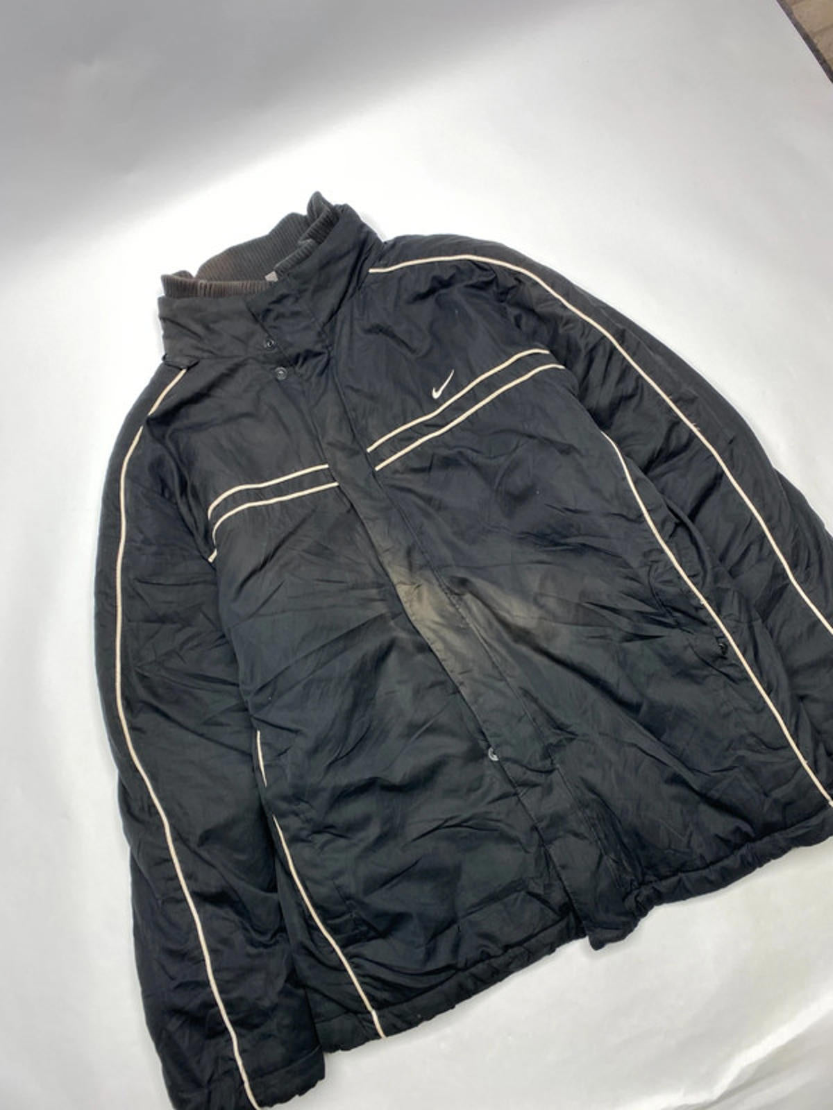 Men's black puffer jacket by Nike featuring white piping details along the chest and sleeves.