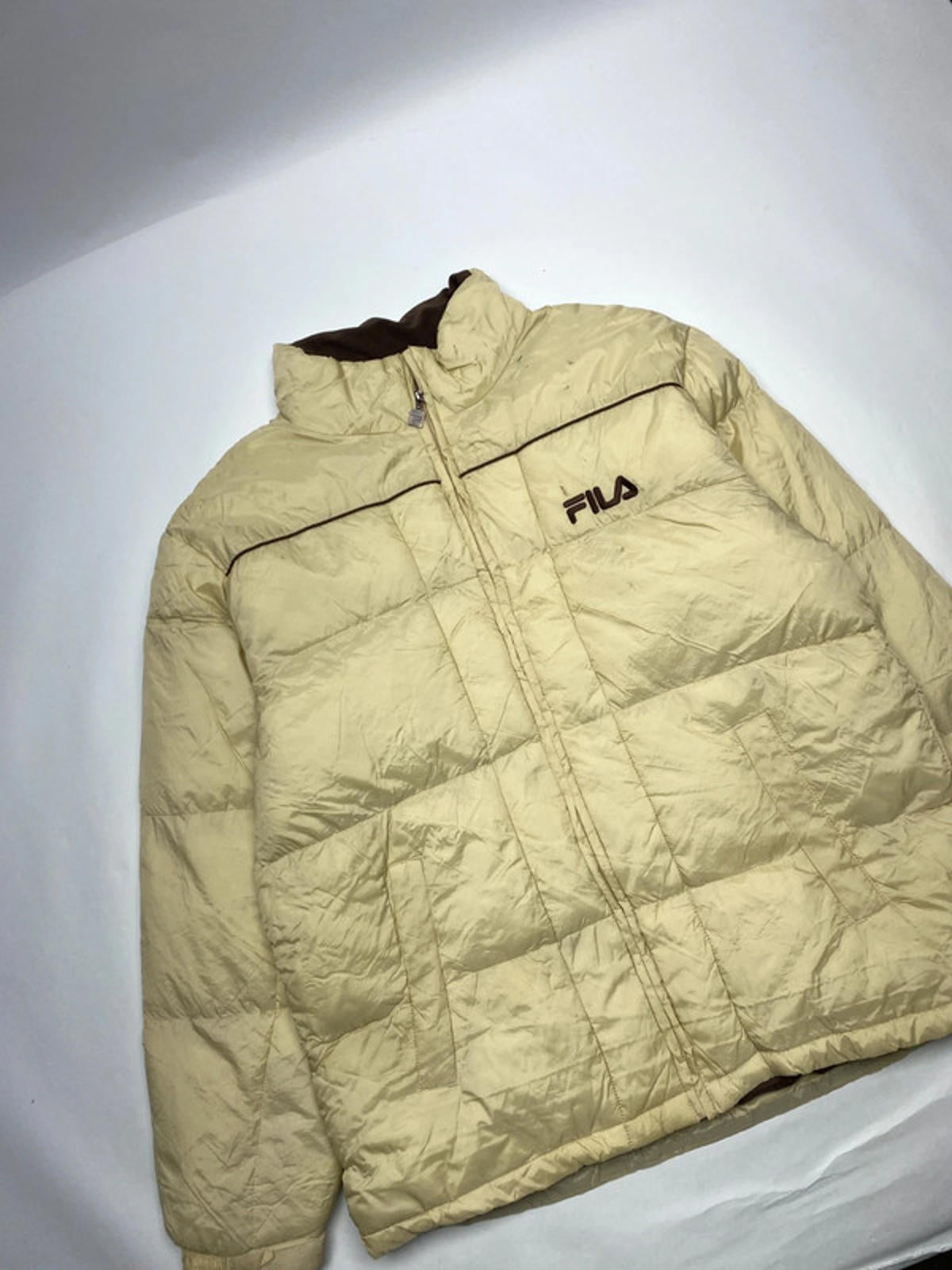 Warm and classic FILA padded winter jacket in a beige colourway with brown fleece lining. Full-zip closure, two side pockets and embroidered FILA chest logo. Very comfortable and ideal for cold weather.