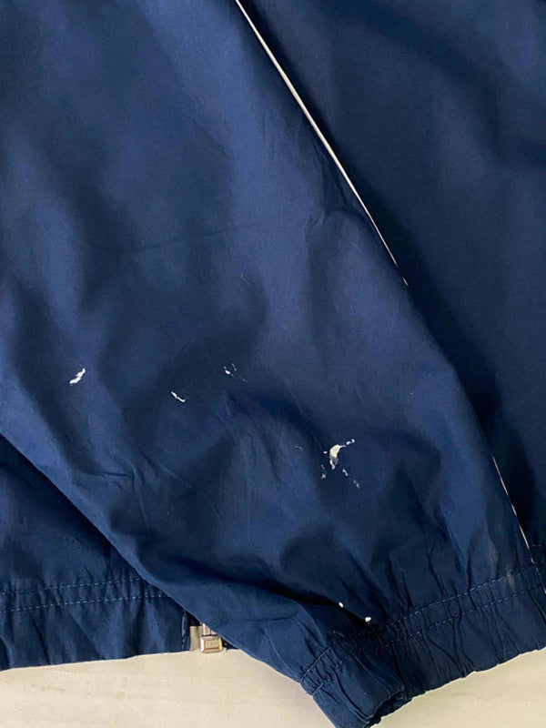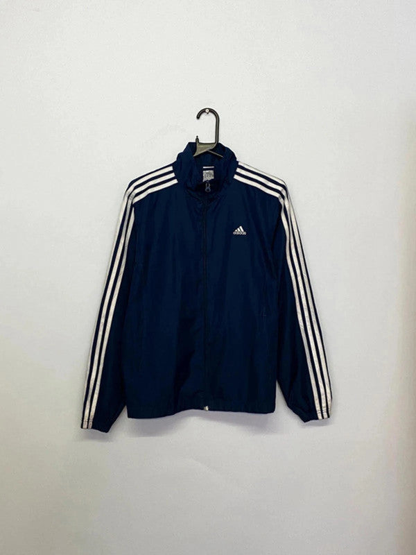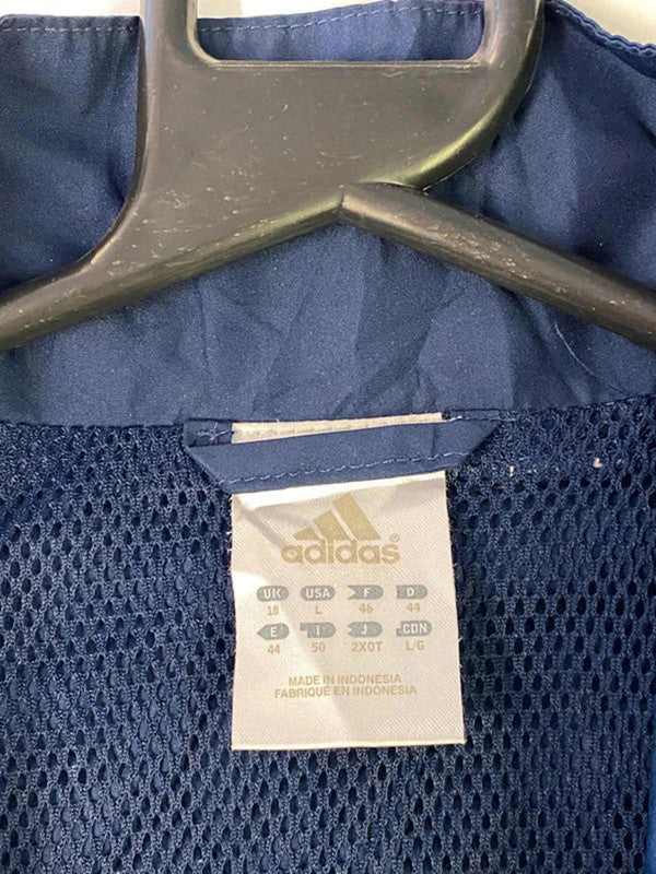 Classic Adidas full-zip track jacket in deep navy blue with signature white 3-stripe detailing along the sleeves and embroidered chest logo. Lightweight and breathable with mesh lining, elastic cuffs, and zip pockets. Size L (UK 18). Made in Indonesia. Ideal for casual wear, street style, or light sports. In very good condition.