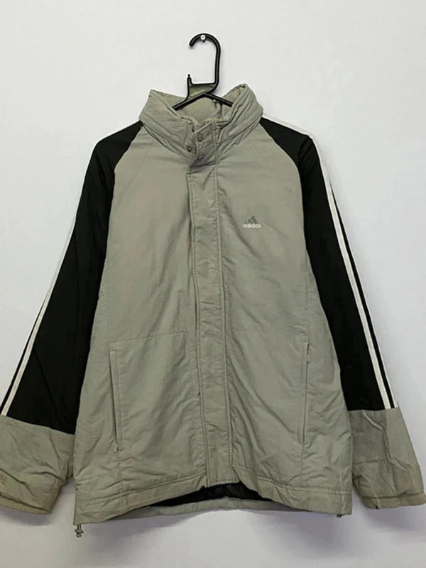Stylish and practical Adidas padded jacket in grey and black with subtle branding and iconic 3-stripe design on the sleeves. – Size: M (UK / US / EU tag shown)