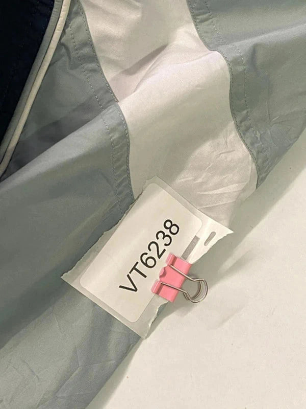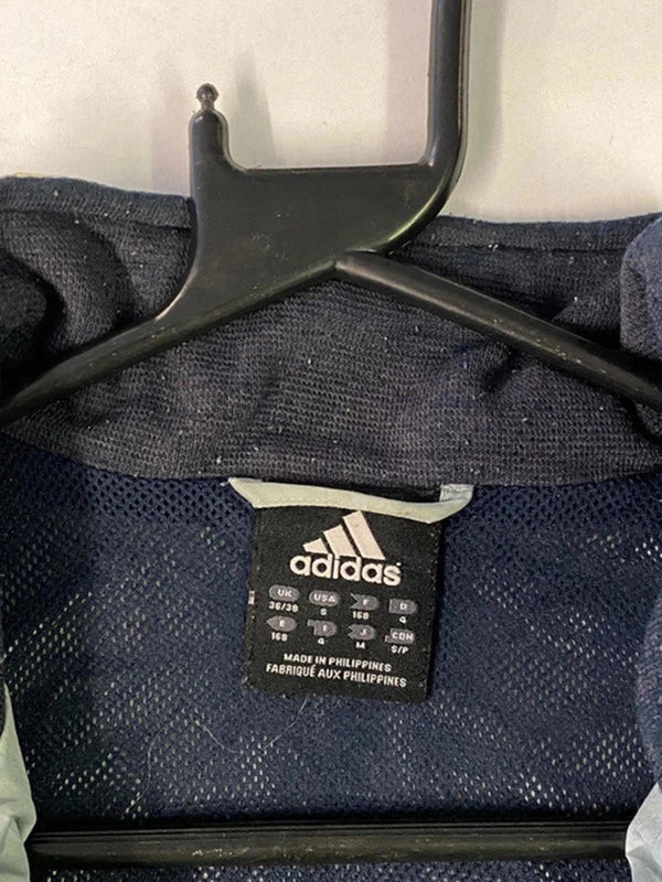 Retro-style Adidas track jacket with a sleek navy, grey, and white colorblock design. Lightweight and breathable with mesh lining – perfect for casual wear, sports, or layering. – Size: S / 168 (Tag shows UK 36/38, USA S, EU 44) – Full-zip front – Two zip side pockets – Adidas embroidered logo on chest