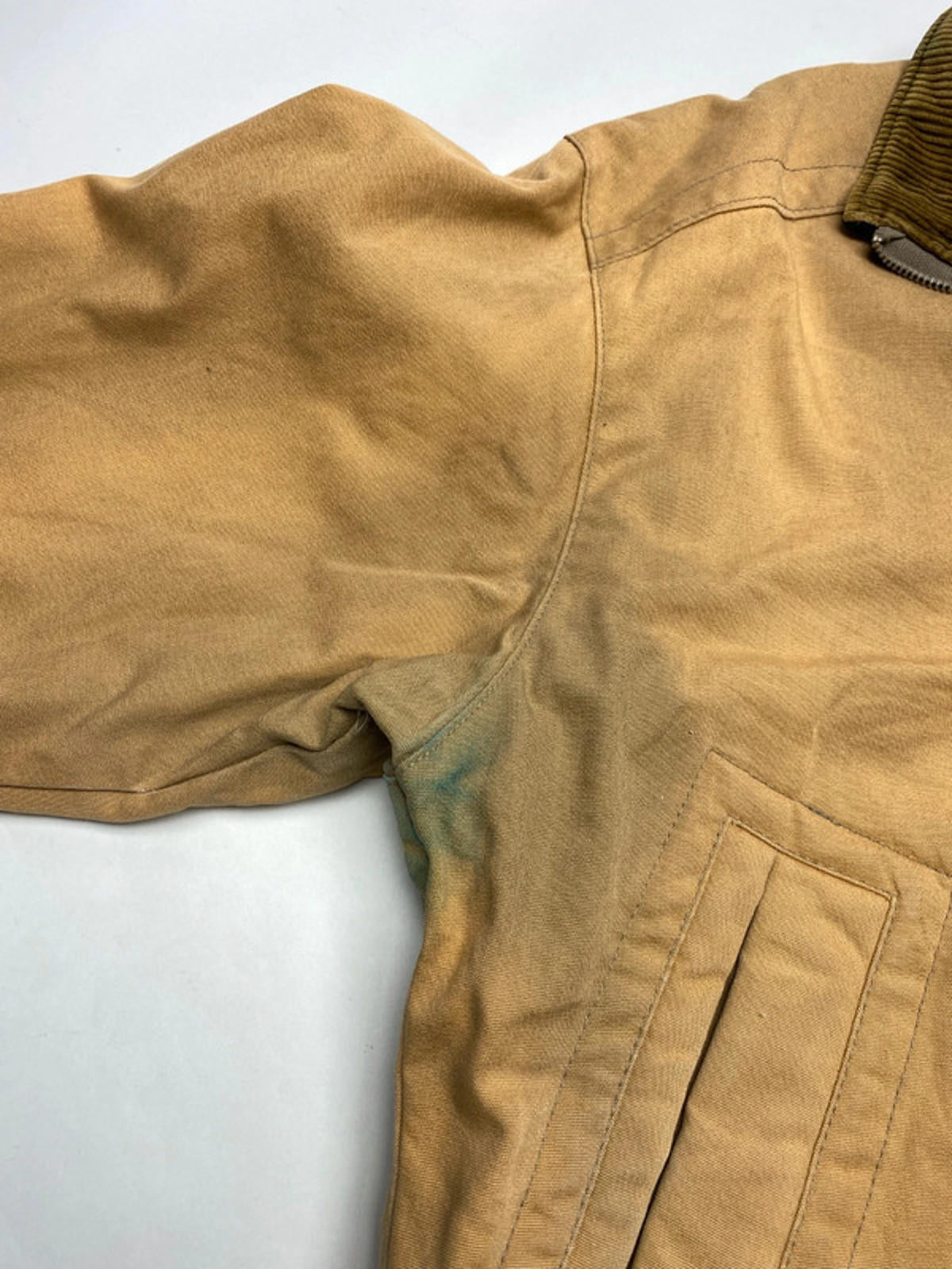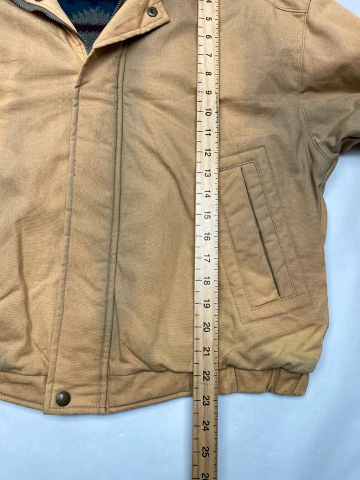 Classic Pendleton Woolen Mills canvas bomber jacket made in the USA. Features a durable tan cotton shell, contrast brown corduroy collar, and Pendleton’s signature Native American–inspired wool pattern lining. A timeless American workwear piece with vintage western vibes.