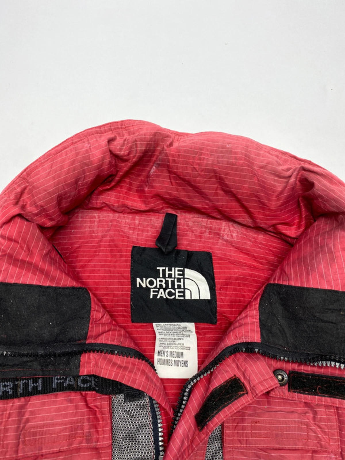 Vintage The North Face ski/snow jacket in a red, black, and grey panel design. Built for durability and cold weather performance, featuring multiple front pockets, storm flap, and adjustable cuffs. Ideal for skiing, hiking, or as a retro outerwear piece.