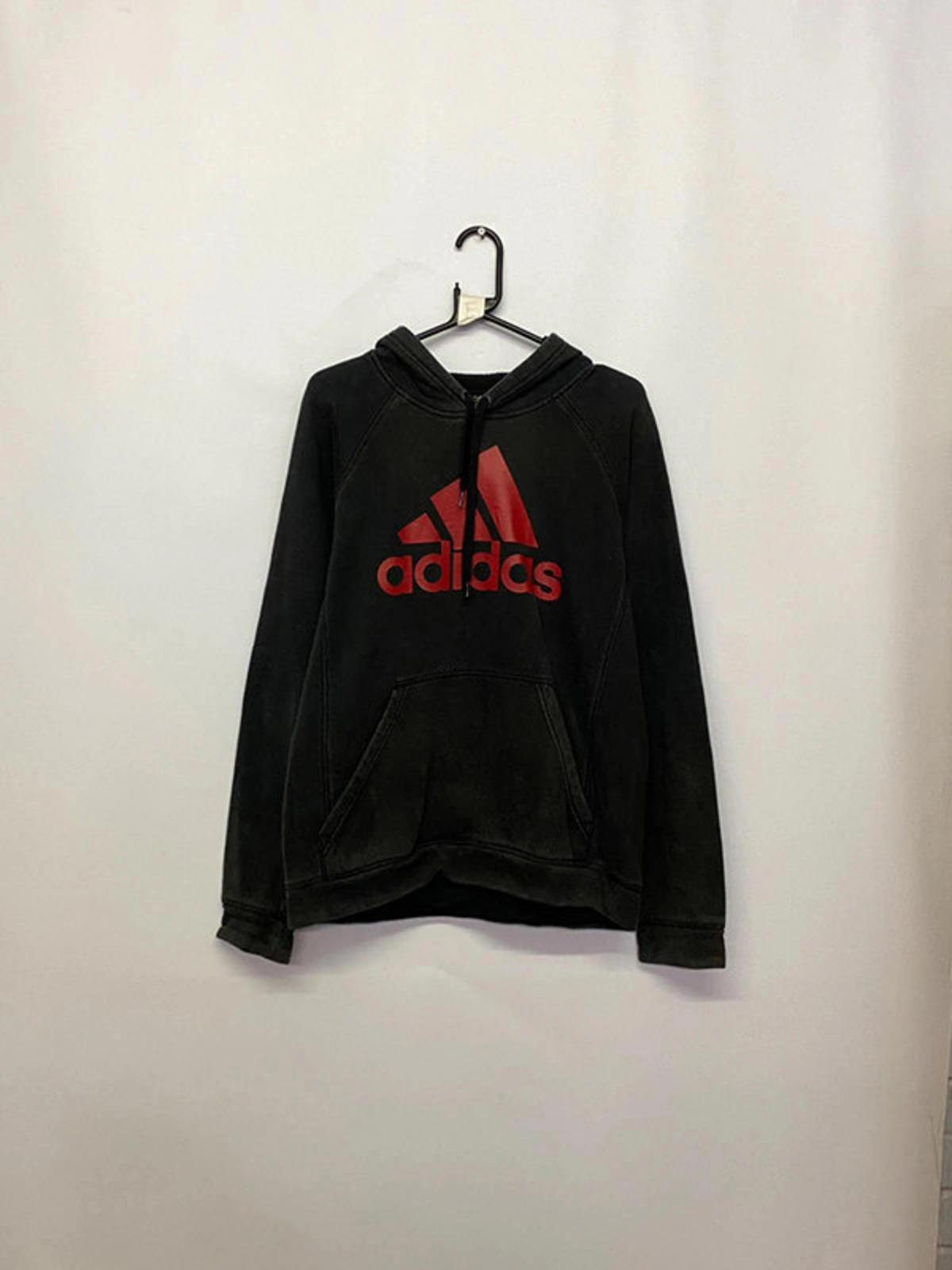 Stylish black Adidas pullover hoodie featuring bold red Trefoil logo across the chest.