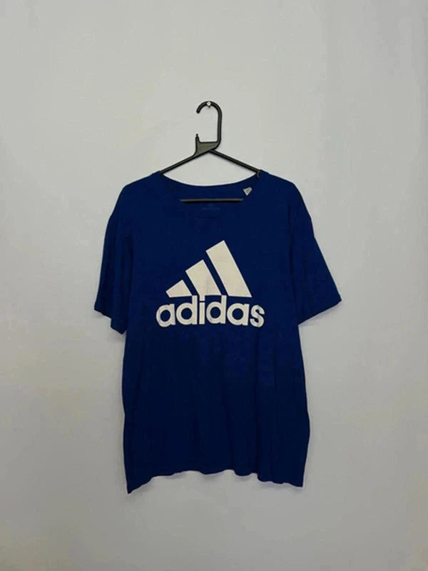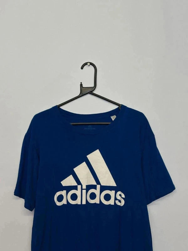 Classic Adidas t-shirt in a bold royal blue with large white Adidas performance logo on the front. Labeled "The Go-To Tee" – designed for all-day comfort with soft cotton fabric. Easy to style for workouts or casual wear. Brand: Adidas Size: L (Large / L/G) Condition: Good used condition – no holes or stains visible
