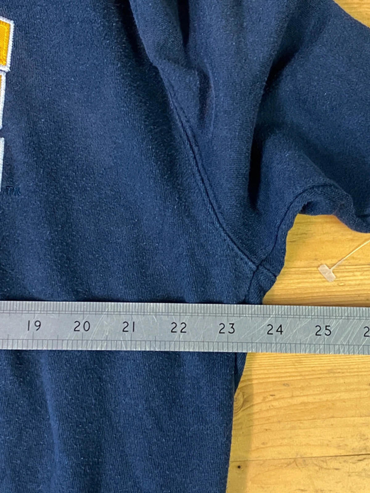 Features contrasting yellow hood lining, drawstrings, front kangaroo pocket, and ribbed cuffs and hem.