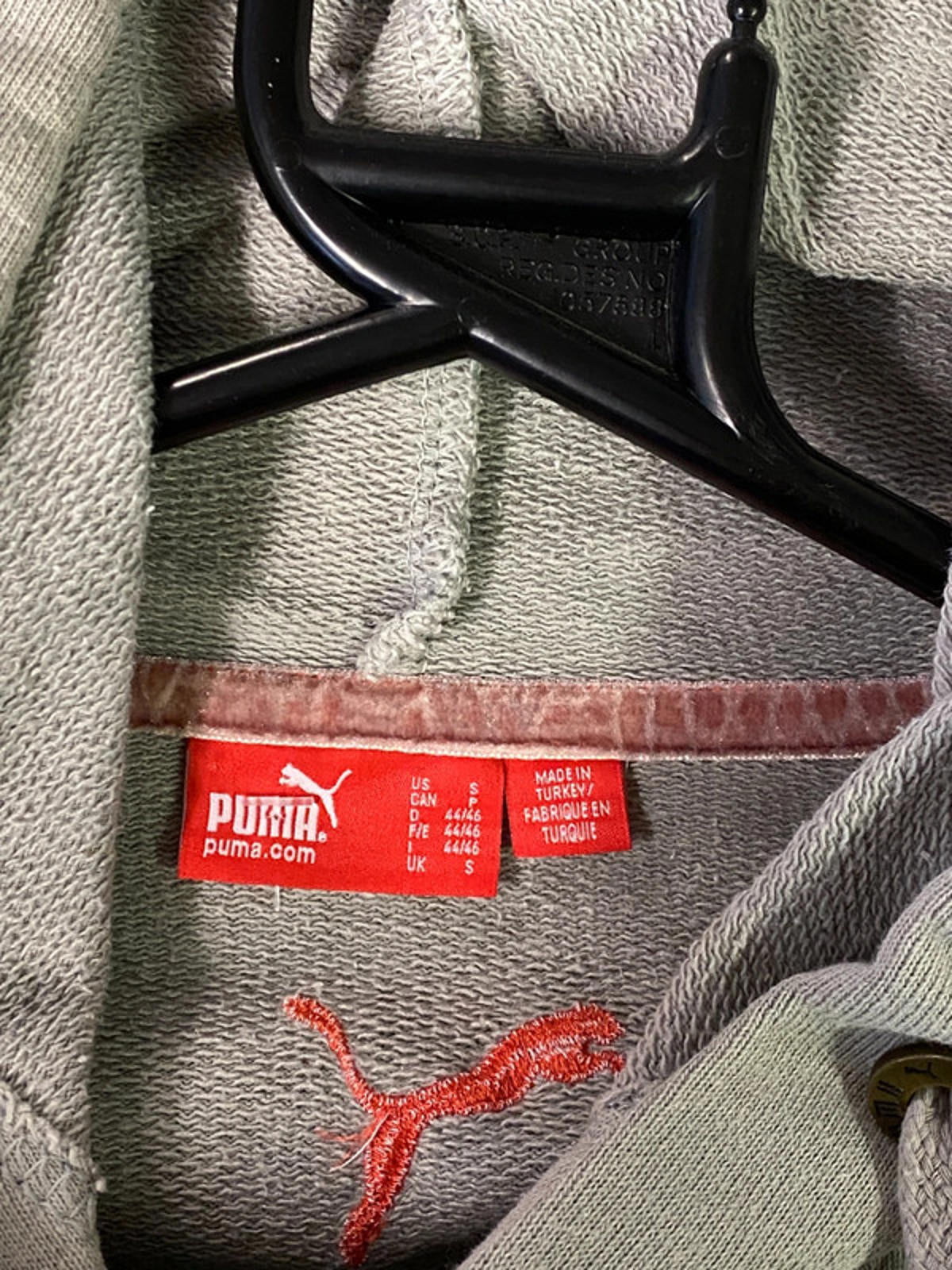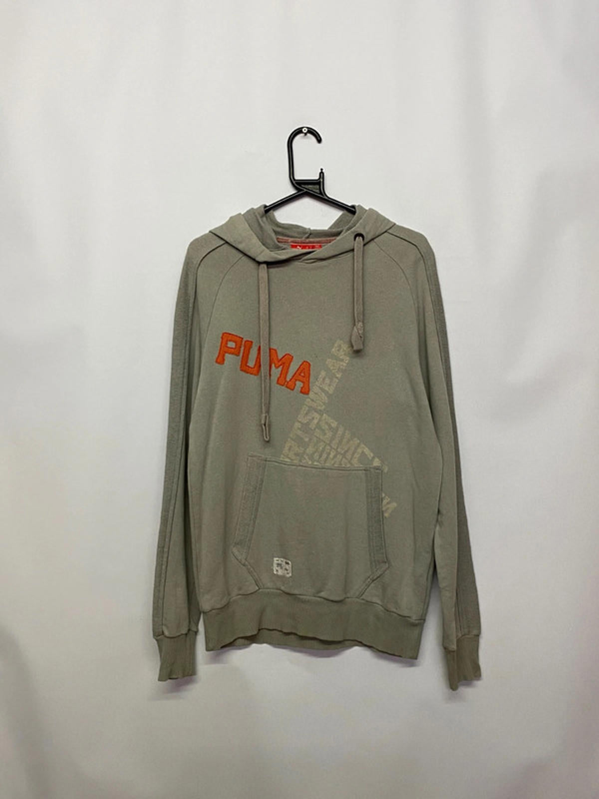 Vintage-style Puma hoodie featuring bold orange logo and textured graphic detail on the front.