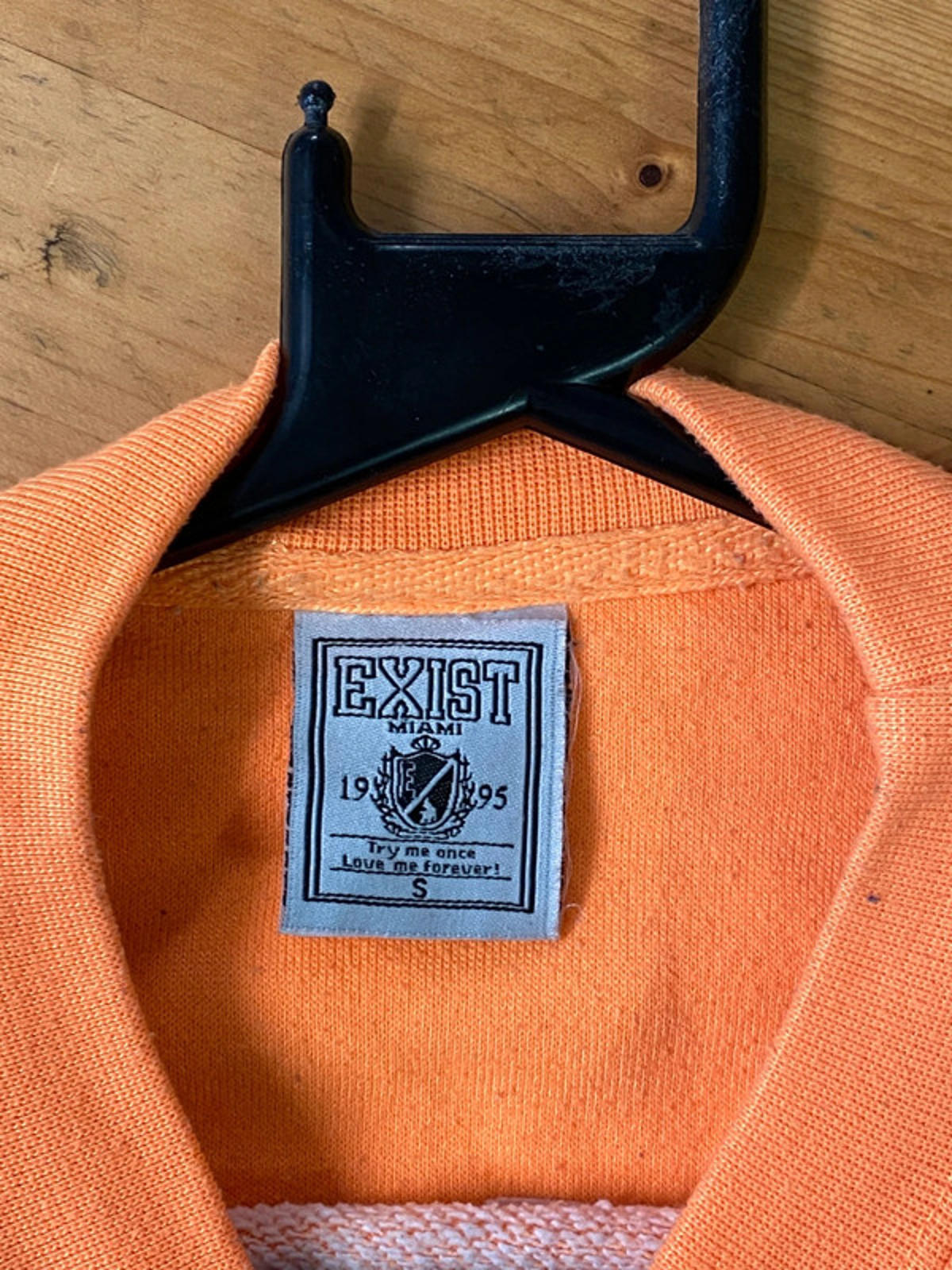 Bright orange Exist Miami sweatshirt featuring classic “Myrtle Beach South Carolina” embroidered text with palm tree graphic.