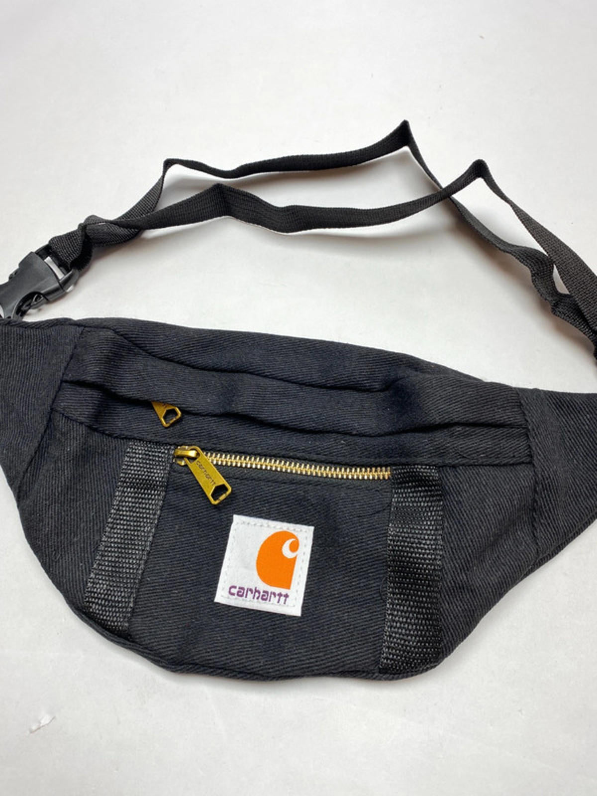 Durable black canvas waist bag from Carhartt, featuring a sturdy gold zipper for secure storage. Adjustable strap for comfortable fit around the waist. Compact design ideal for carrying essentials hands-free. Perfect for casual outings, travel, or everyday use.