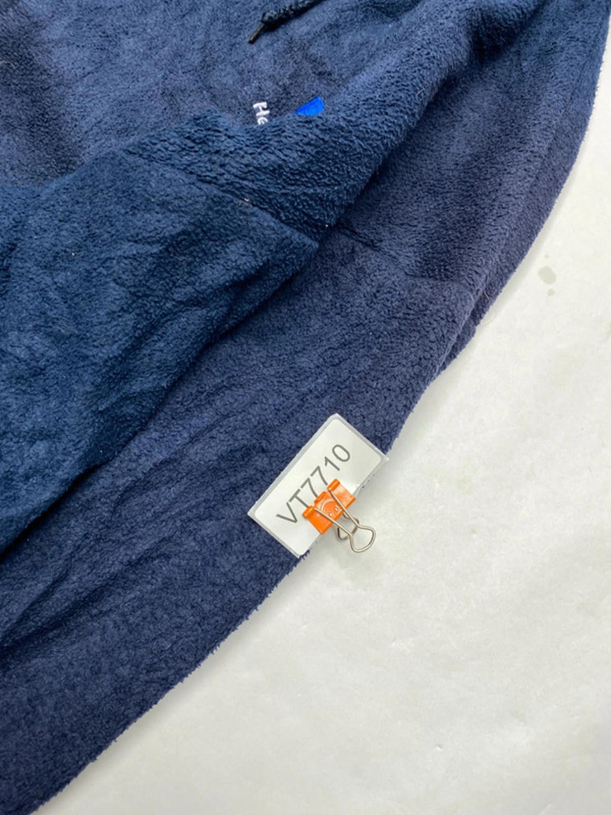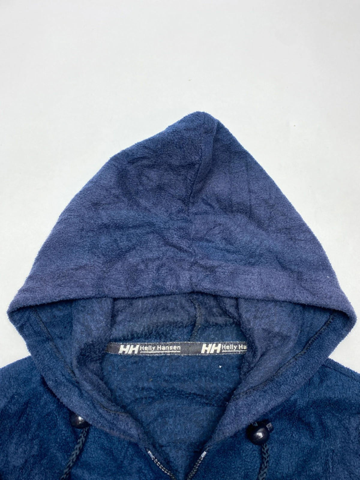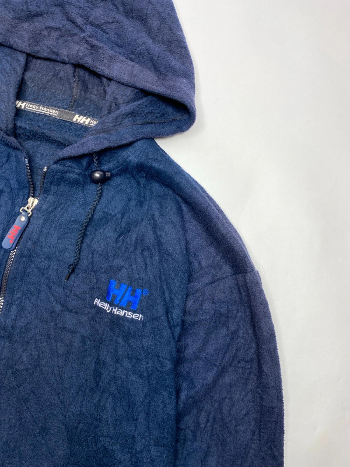 Vintage Helly Hansen navy blue full-zip hoodie made from soft terry towel fabric — lightweight, breathable, and perfect for post-swim, sailing, or casual wear. Features include embroidered HH logo on the chest, adjustable hood with drawcords, front pockets, and drawstring hem. Size: Tag not visible, fits like Men’s M–L (pit to pit approx. 23 in / 58 cm). Condition: Good vintage condition – minor creasing from storage, no major flaws.