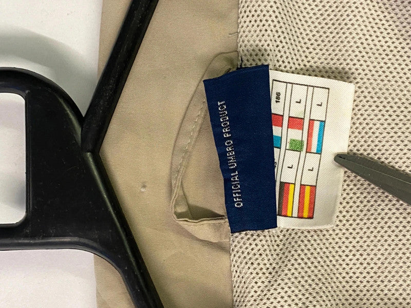 Size: Likely Men’s L (check measurements for best fit) Colour: Beige with brown accents and black piping Material: Polyester with mesh lining