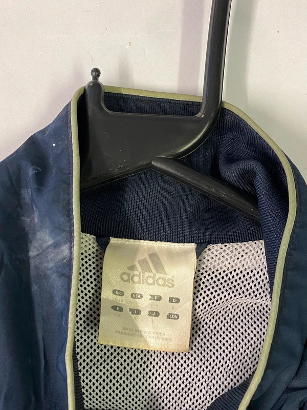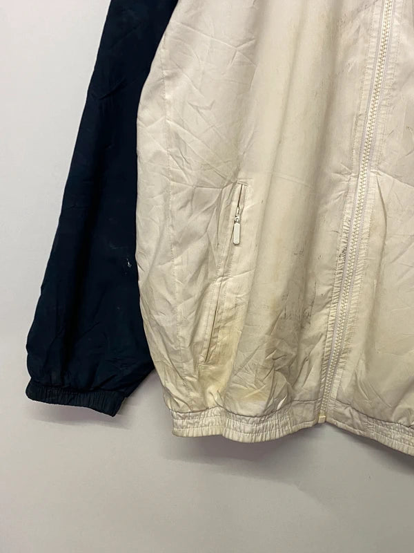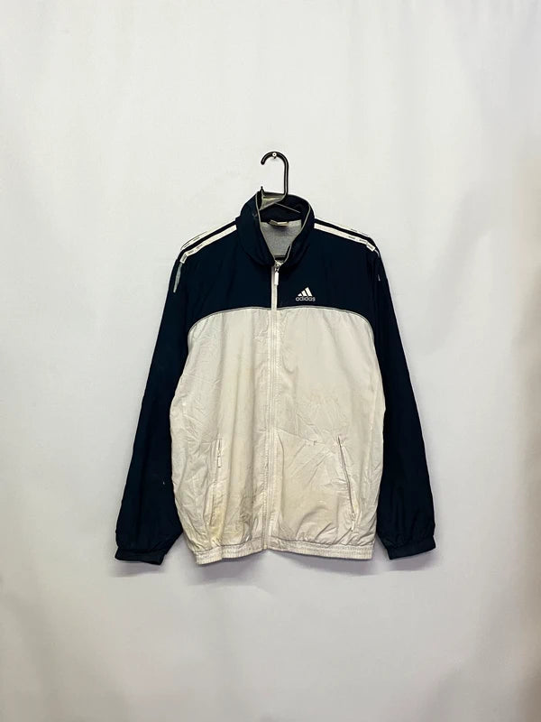 Retro Adidas silver and black colour block windbreaker with high neck, full zip fastening, and two front zip pockets. Features Adidas branding on chest and stripe detail down sleeves. Lightweight and perfect for layering.