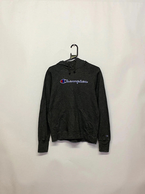 Colour: Charcoal grey Size: S (Unisex fit – refer to measurements for best fit) Style: Pullover hoodie with kangaroo pocket Logo: Large embroidered Champion script logo on chest + “C” sleeve logo