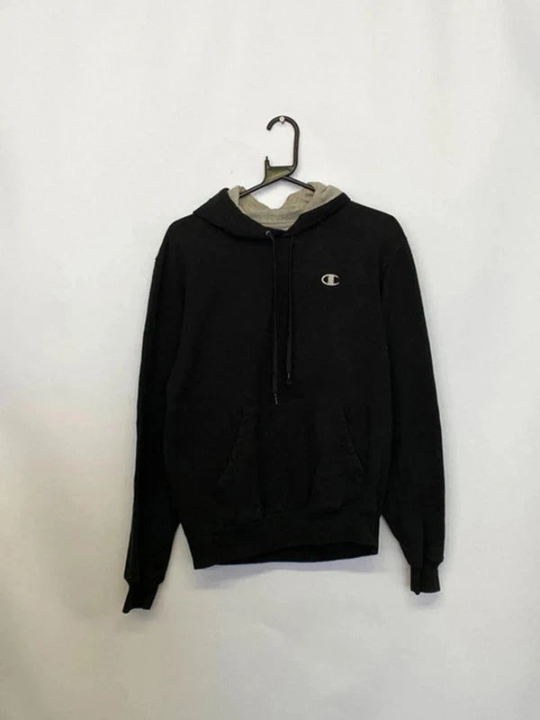 π€ Classic Champion black pullover hoodie with grey contrast inner hood. π§΅ Features the embroidered βCβ logo on the chest and a roomy kangaroo pocket. π Part of the Champion Eco line β made from recycled materials. π Tagged size S β suitable for a snug fit or womenβs oversized look.