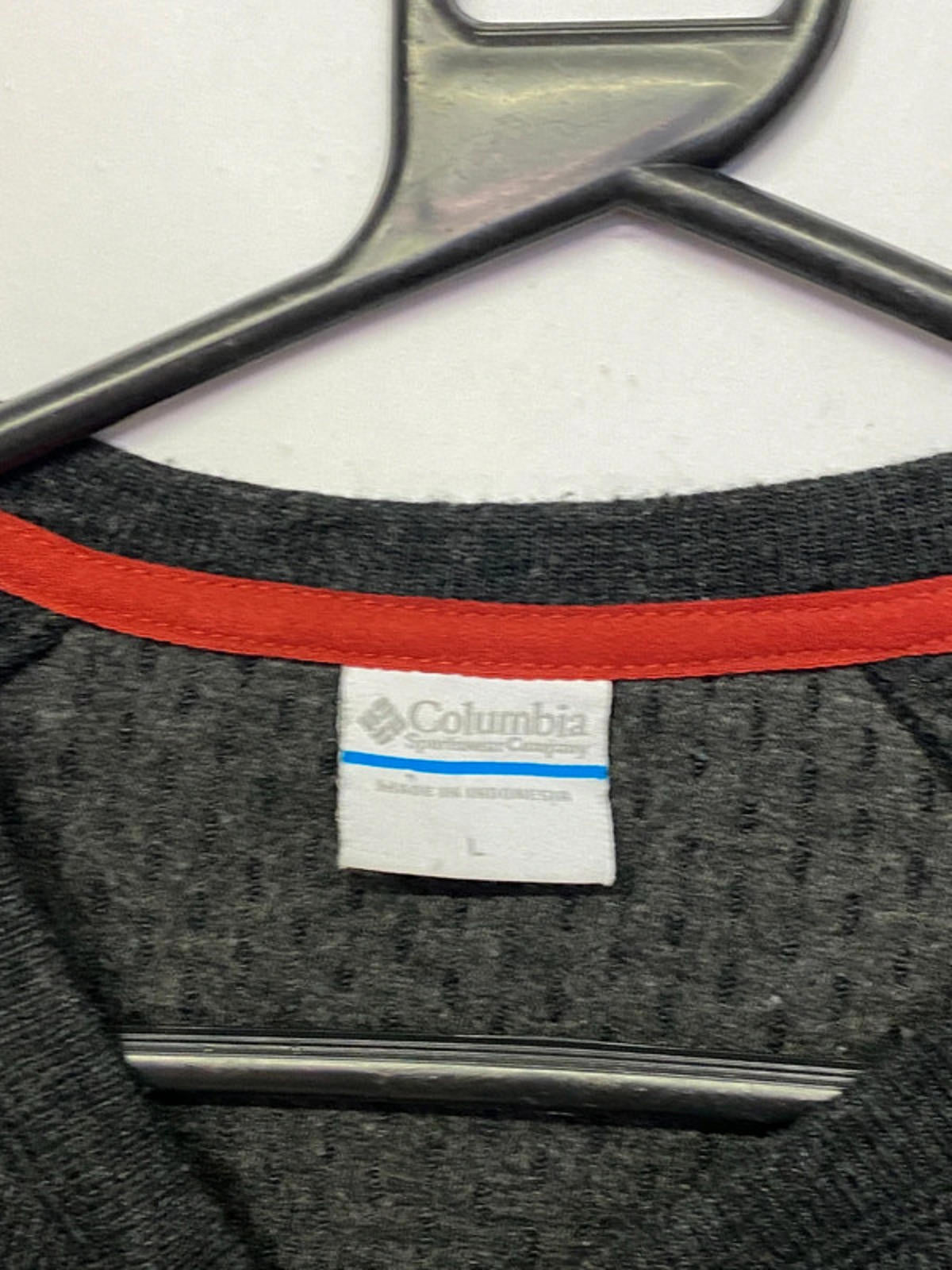 Columbia Sportswear performance long sleeve top in charcoal grey with subtle embroidered logo on chest.