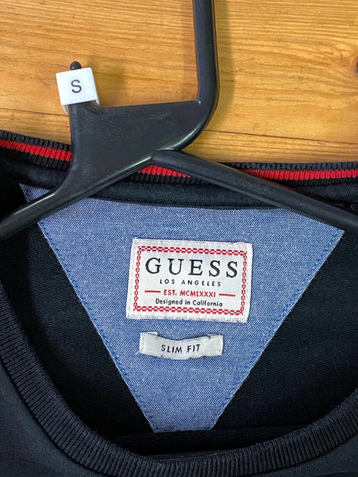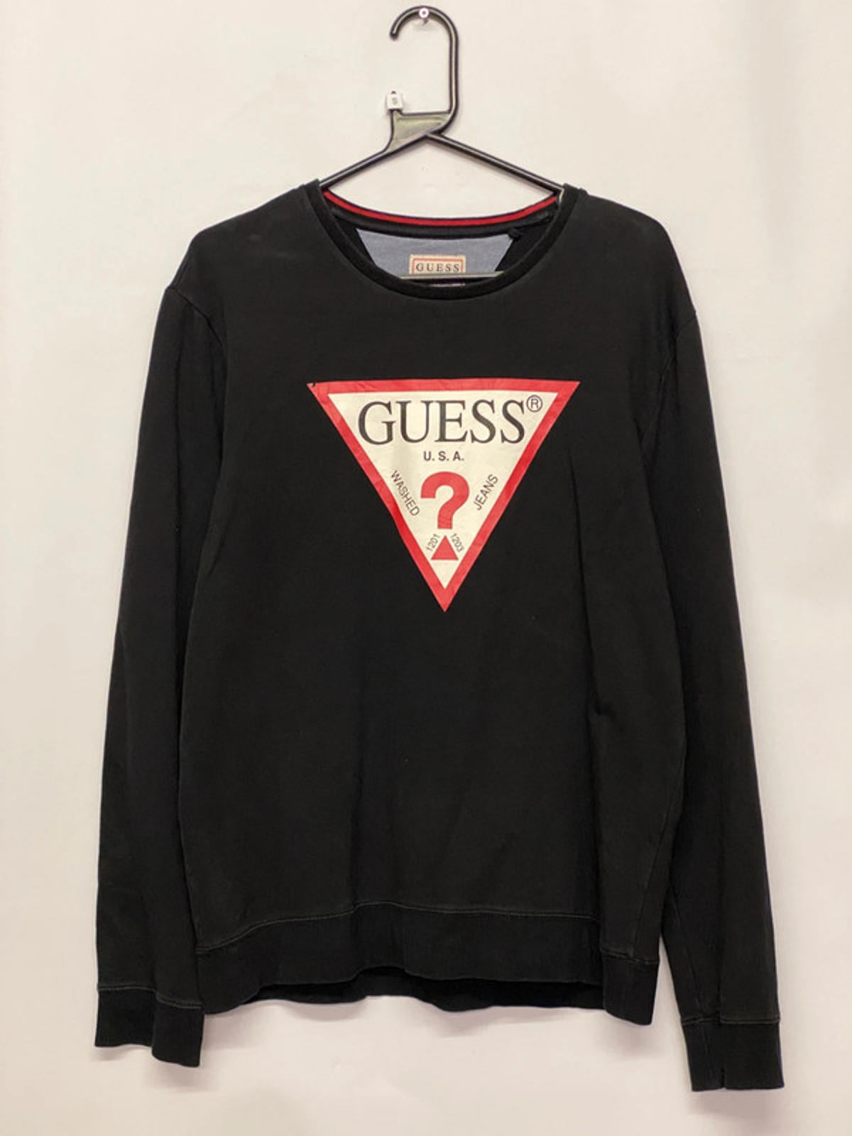 Classic GUESS crewneck sweatshirt in black with the signature red triangle logo on the chest.