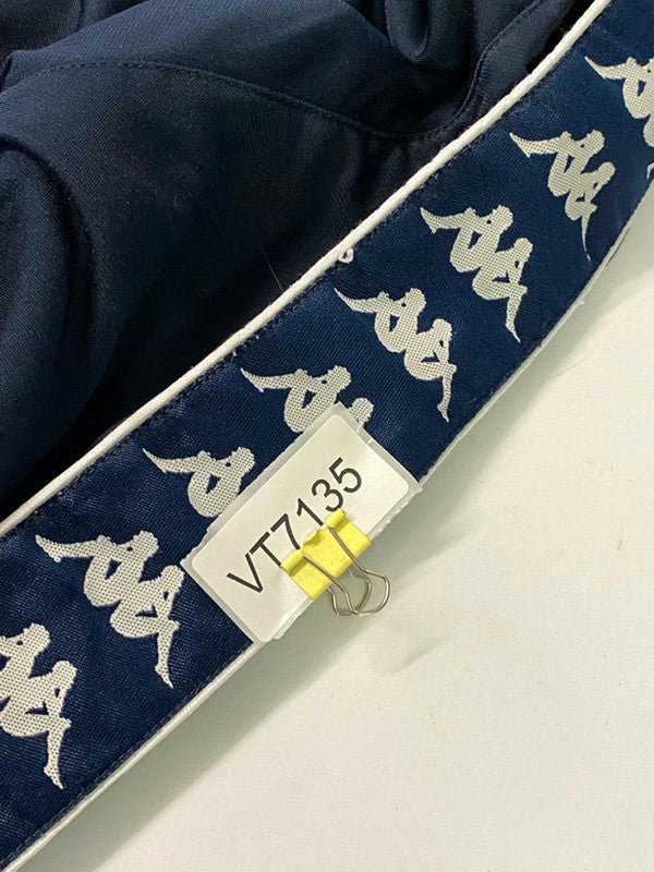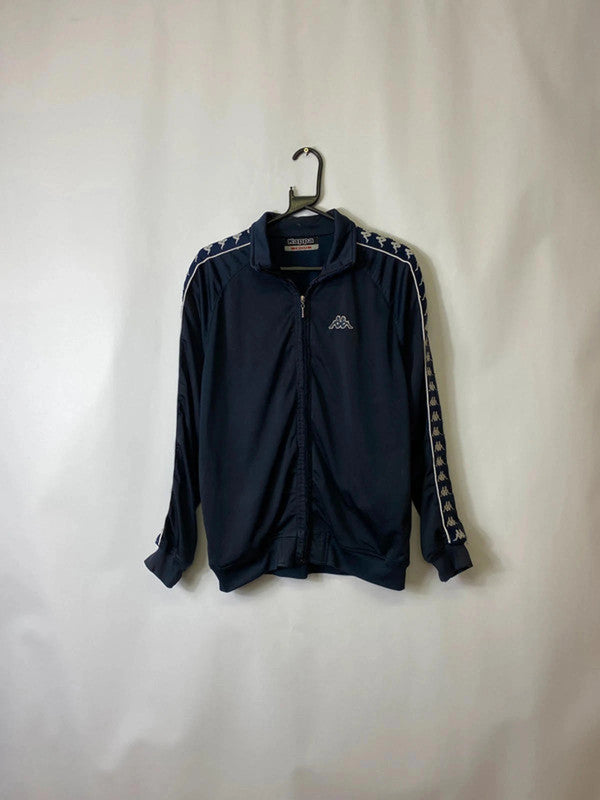 Kappa navy blue track jacket with iconic white logo tape down the sleeves and embroidered chest logo. Features full front zip, ribbed cuffs and hem,