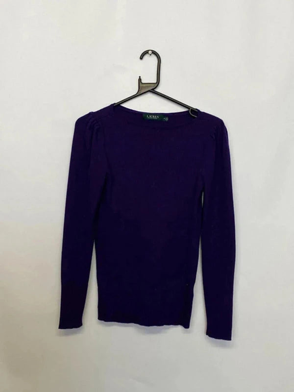 ๐ Elegant and classic Lauren Ralph Lauren ribbed knit top in a rich purple shade. ๐งต Fine knit construction with subtle puff detail at the shoulders for a feminine touch. ๐ Flattering fitted silhouette, perfect for both smart casual wear and layering. ๐ Tagged size M โ true to size with stretch for comfort.
