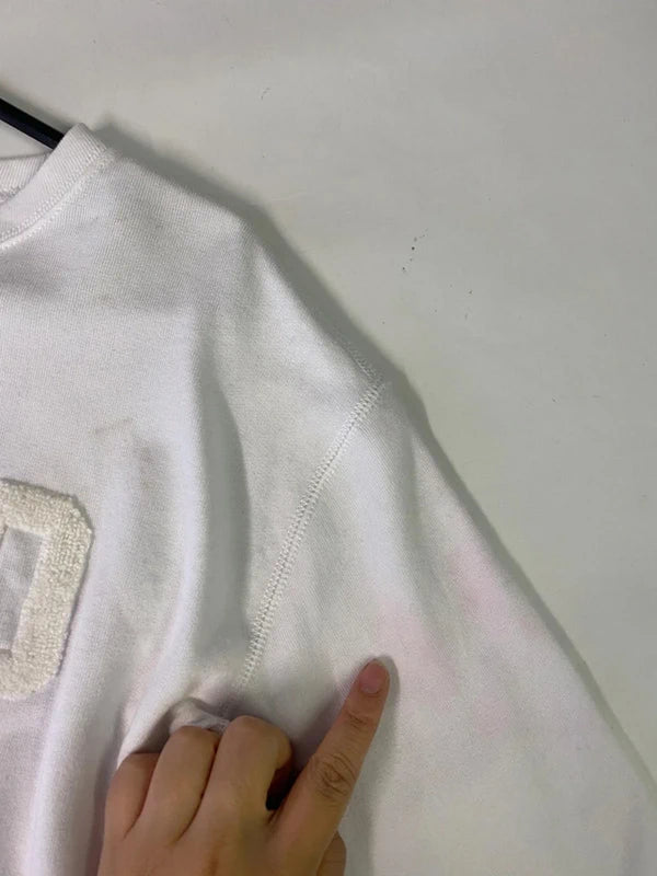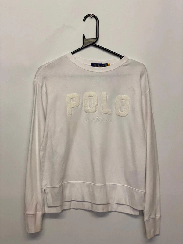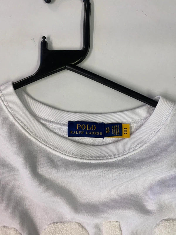 Polo Ralph Lauren white crewneck sweatshirt in size XS (Extra Small). Features a large chenille “POLO” logo on the chest and subtle “Ralph Lauren” embroidery underneath.