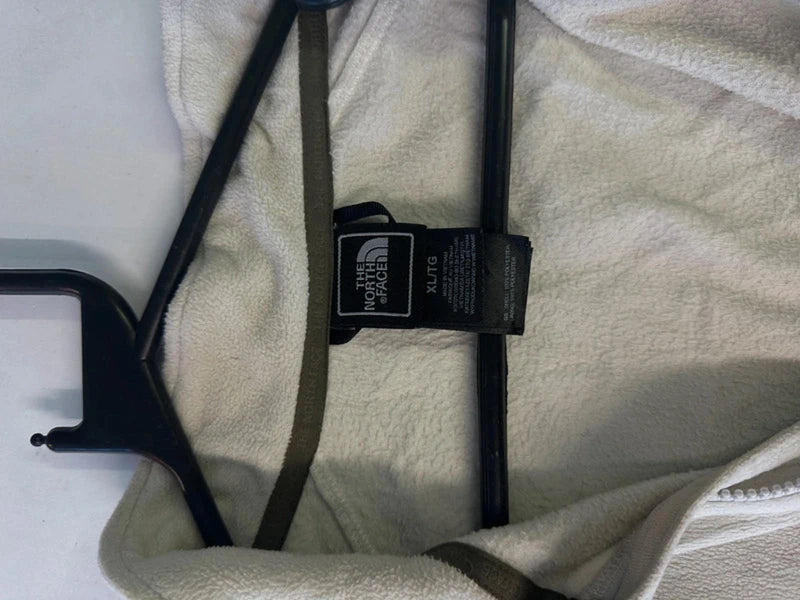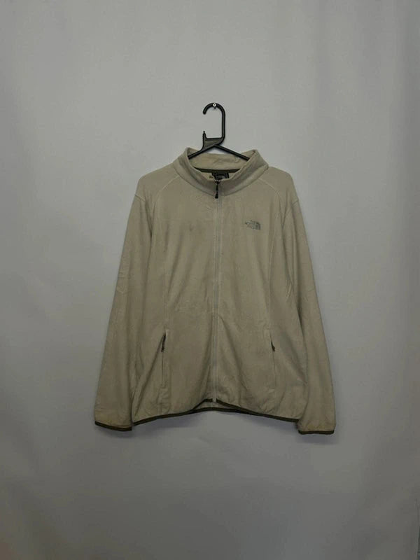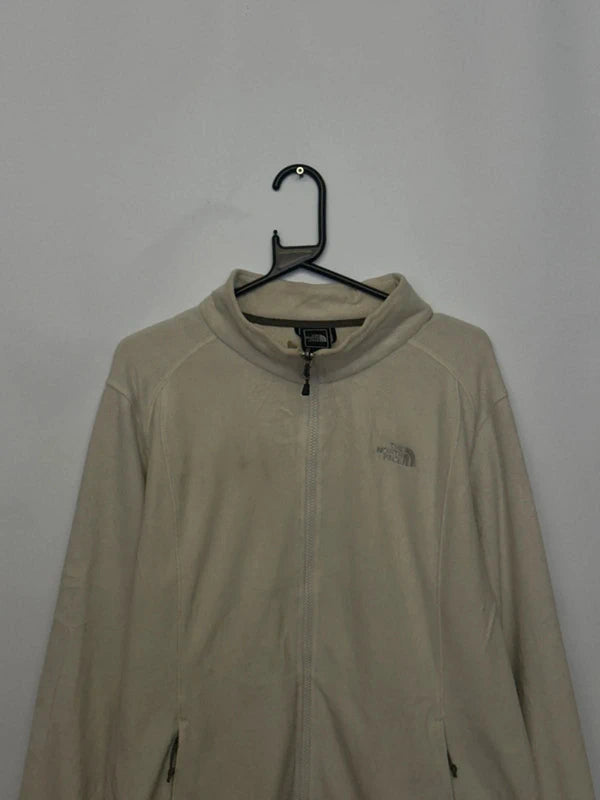 Soft and cozy beige fleece jacket from The North Face with full zip front and embroidered logo on the chest. Ideal for layering, hiking, or everyday casual wear. Size: Men’s XL (XLTG) Full zip front with two zippered side pockets Embroidered North Face logo on chest and back shoulder Elasticated cuffs and hem
