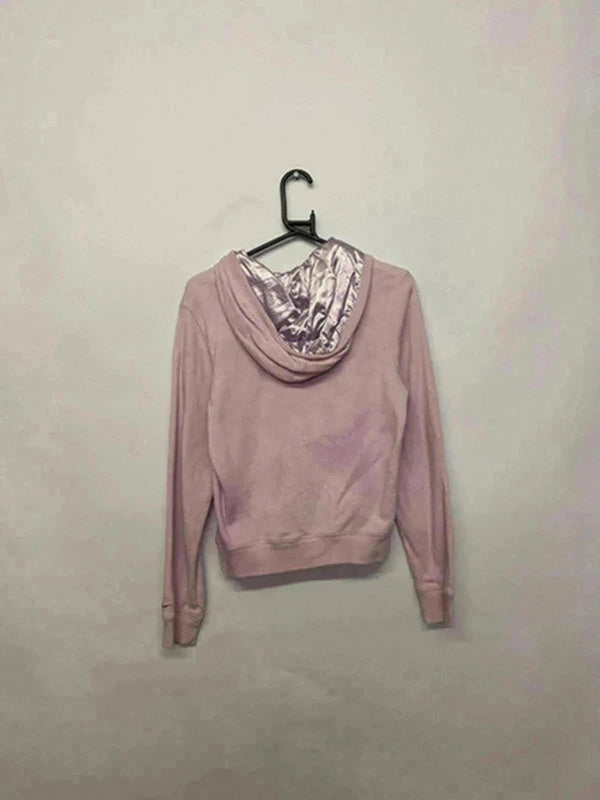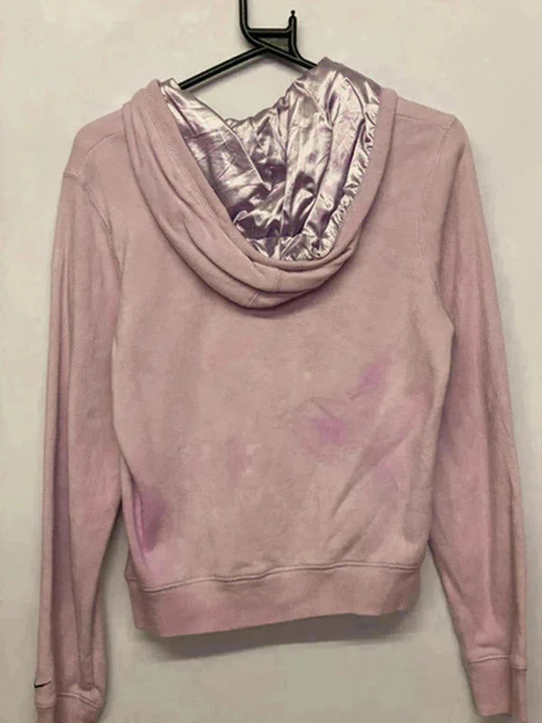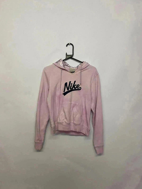 Cute vintage Nike hoodie in a light pink colour with dark blue embroidered “Nike” script logo on the chest. Features a front kangaroo pocket, drawstring hood, and ribbed cuffs and hem. The hood is lined with a shiny satin-like fabric for a nice touch.