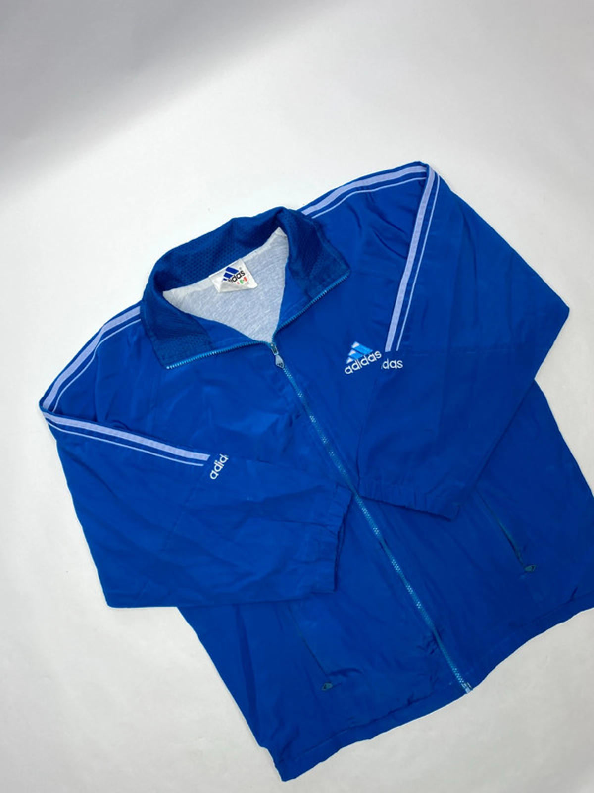 Vintage-style Adidas track jacket in bold royal blue with white 3-stripe detailing on shoulders and sleeves. Features embroidered Adidas chest logos, full front zip, mesh lining, and two zippered pockets. Classic sporty look — perfect for Y2K streetwear or casual retro outfits. Size: Men’s XL (Tag: XXL US / XL UK approx.) Material: Polyester shell with mesh lining Condition: Good vintage condition – some light creasing from storage, but no major flaws or stains.