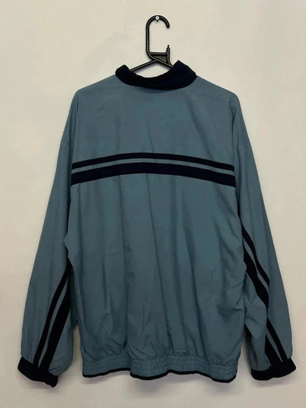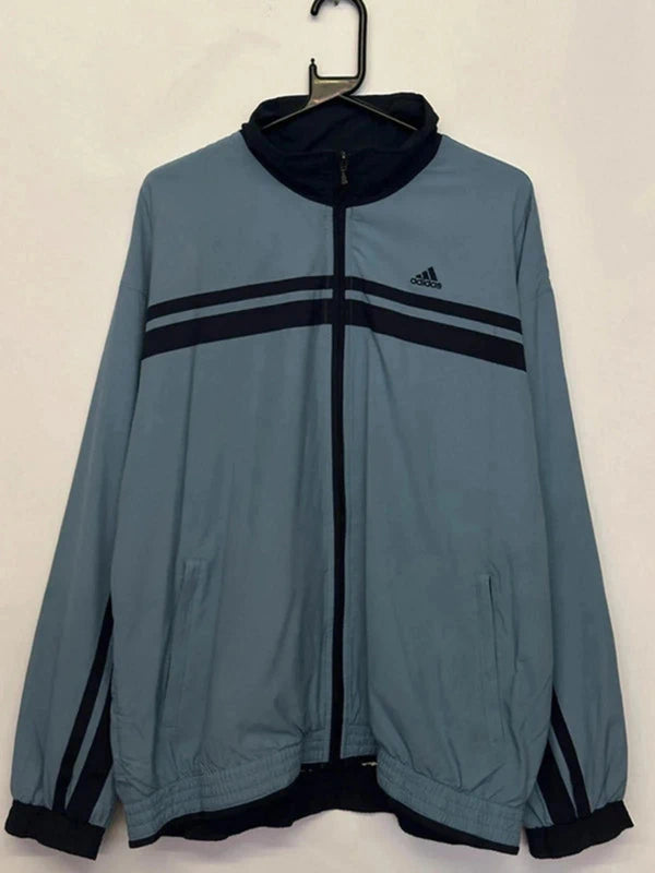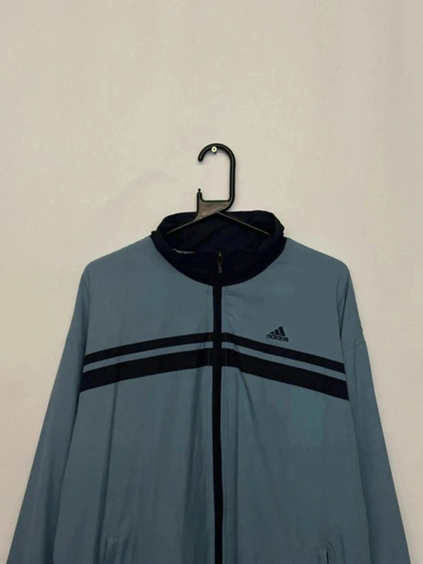 etro-style Adidas jacket in a rare light blue and navy colourway, featuring double horizontal chest stripes and classic 3-stripe sleeve detailing. Great lightweight layering piece with subtle vintage flair. Men’s size L (GB 42–44 / D52 / USA L) Full zip front with two side pockets