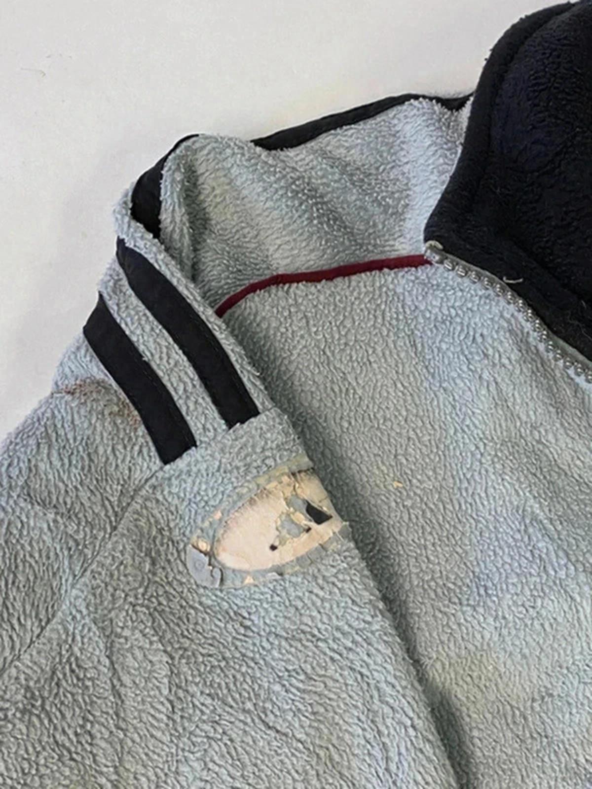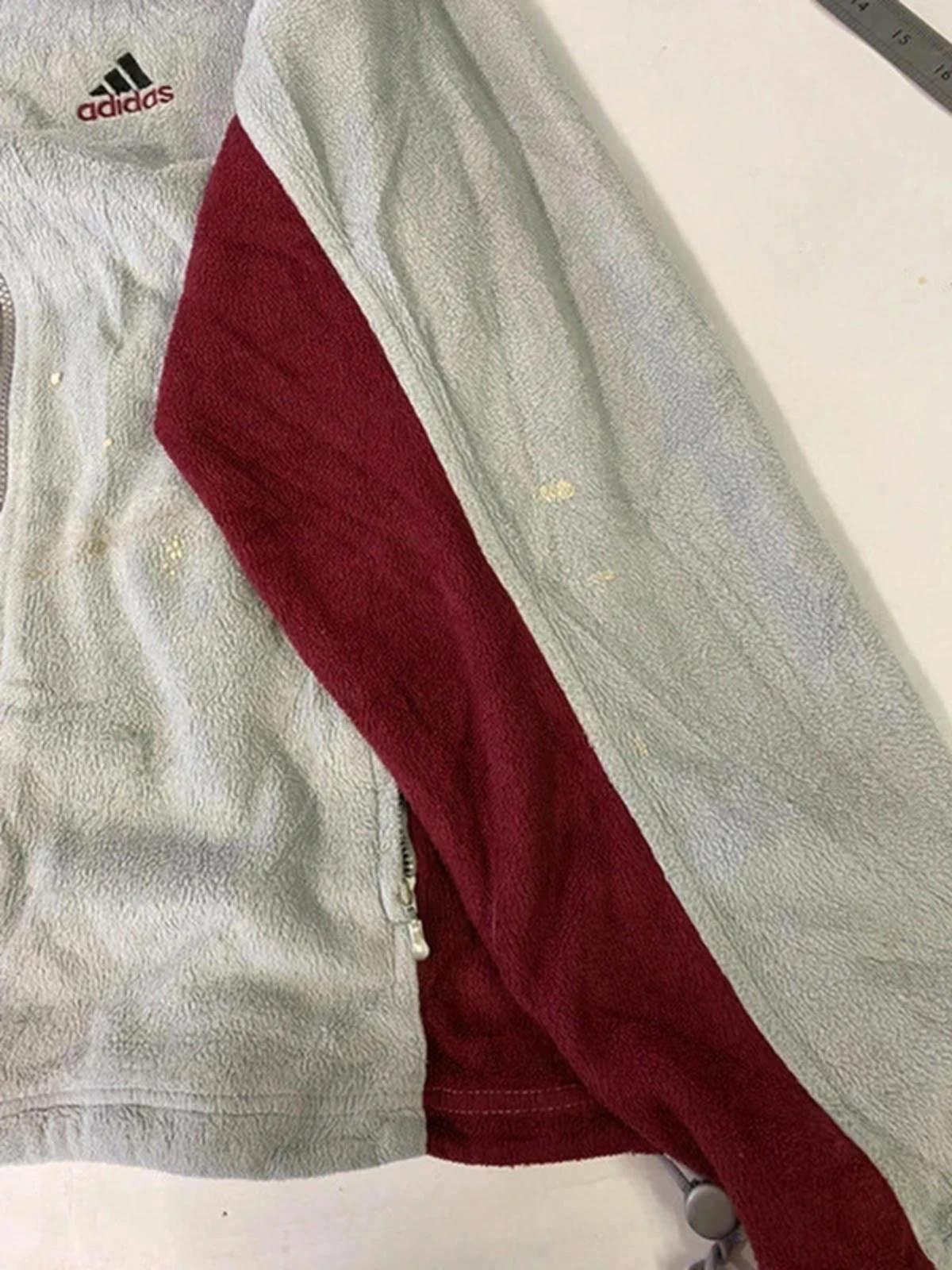 Men's activewear jacket by Adidas, featuring a full zip front and a comfortable fit. Primary colour is grey with burgundy side panels and black collar. Ideal for casual wear or sports activities. Lightweight and breathable fabric ensures comfort during physical activity. Classic Adidas logo embroidered on the chest. Please note there are minor signs of wear consistent with previous use.