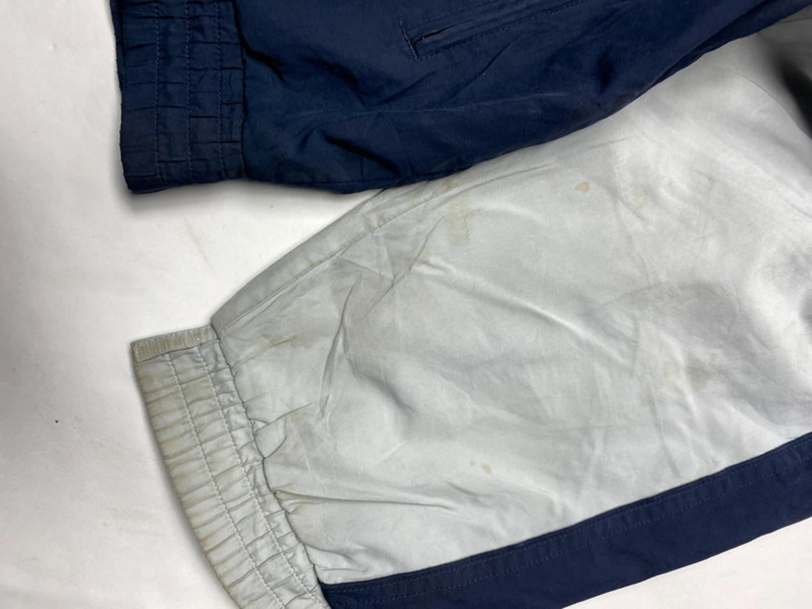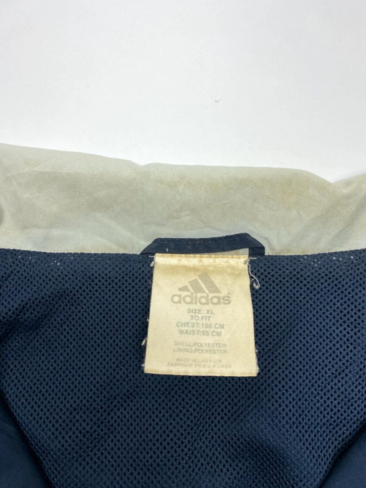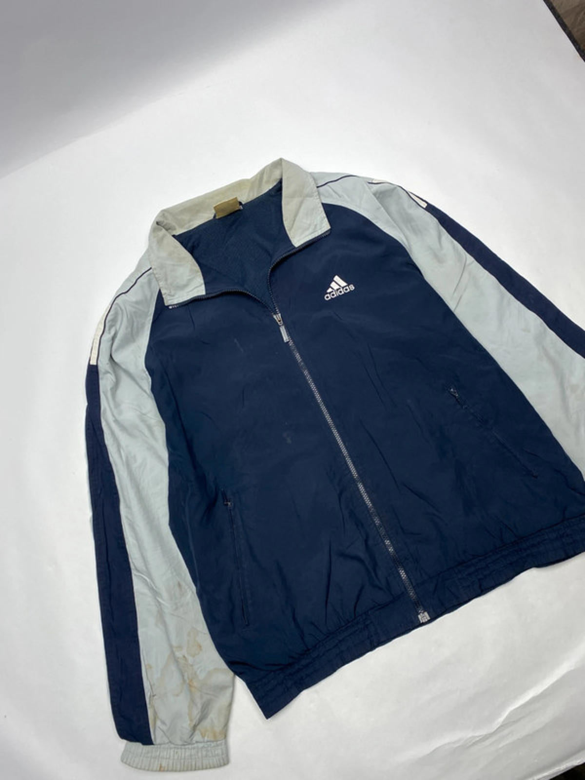 Vintage Adidas full-zip track jacket in navy and light grey.