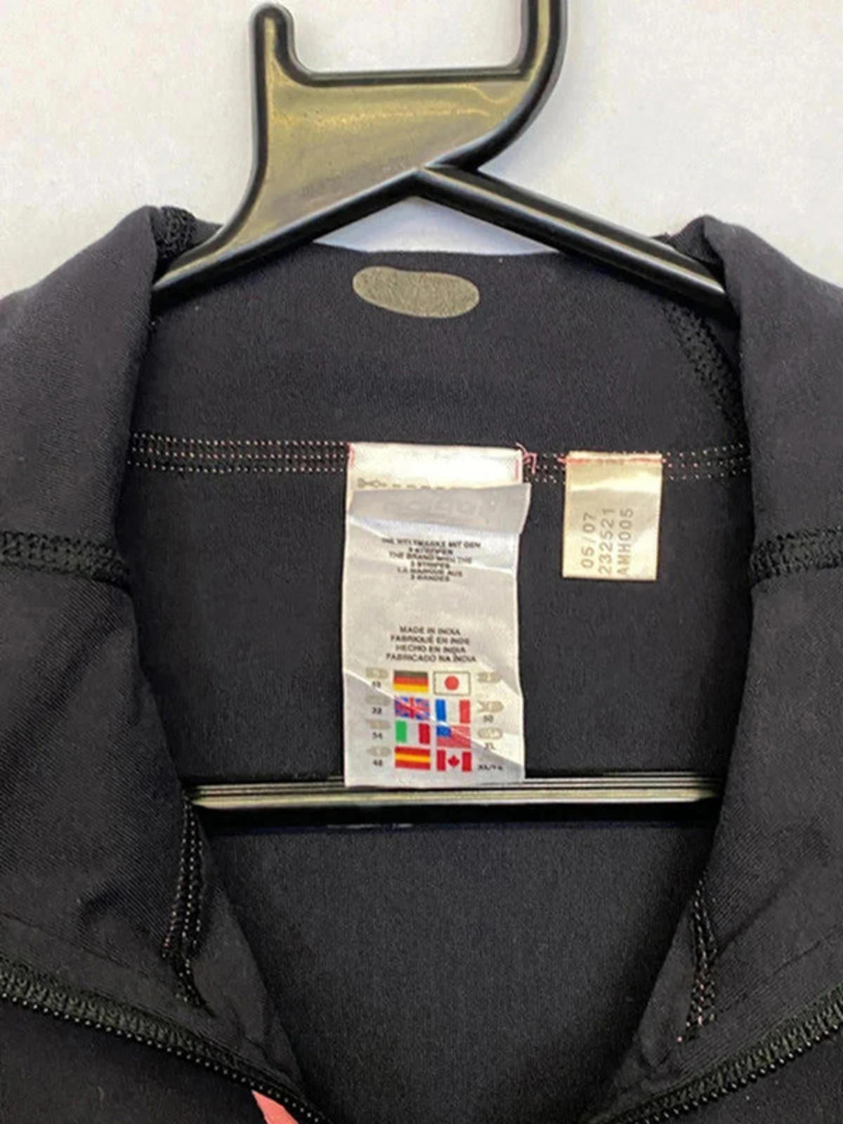 Adidas women's activewear jacket in black with coral accents. Features full front zip closure and long sleeves with thumb holes. Lightweight and comfortable, ideal for workouts or casual wear. Made from breathable fabric for optimal performance. Size: Medium (please confirm with measurements if needed).