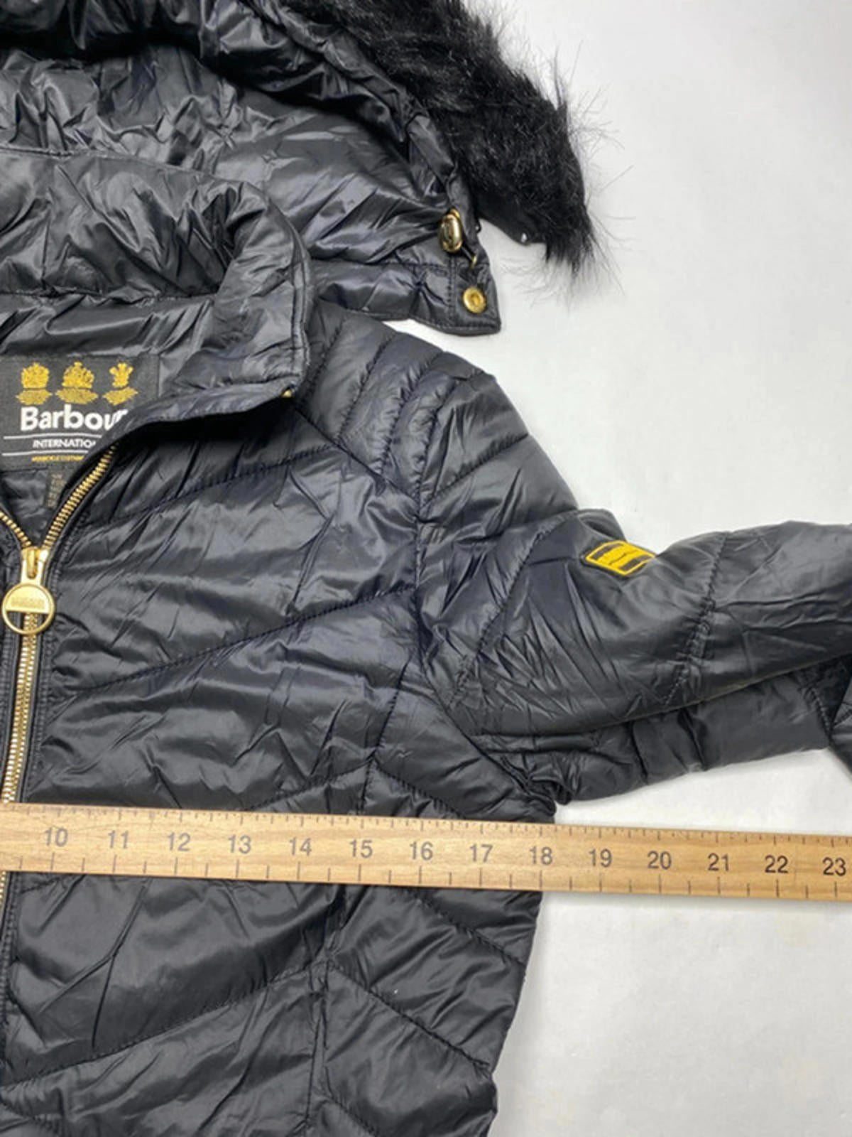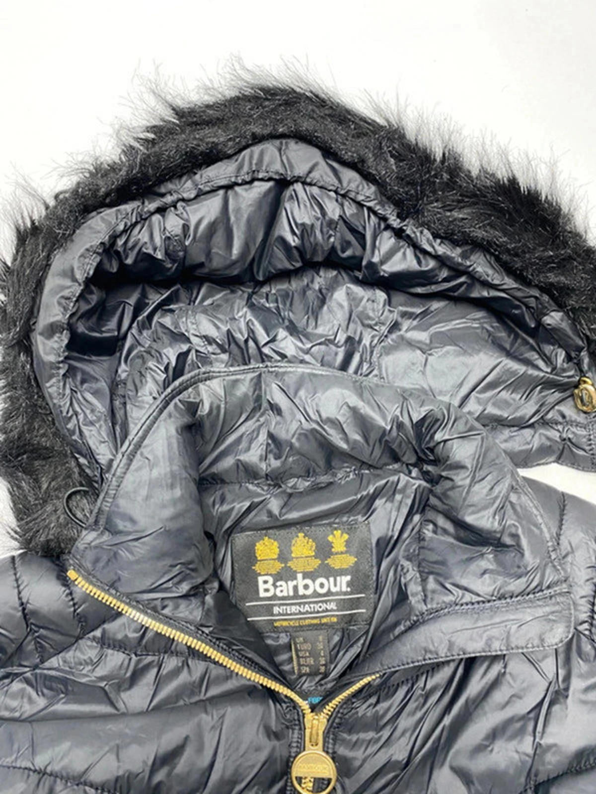 Stylish black quilted jacket from Barbour featuring a warm hood with faux fur trim. Gold-tone zipper details and multiple zippered pockets for secure storage. Ribbed cuffs for added comfort and warmth. Ideal for cooler weather and casual wear. Please note there is minor wear on one sleeve as shown in the images.