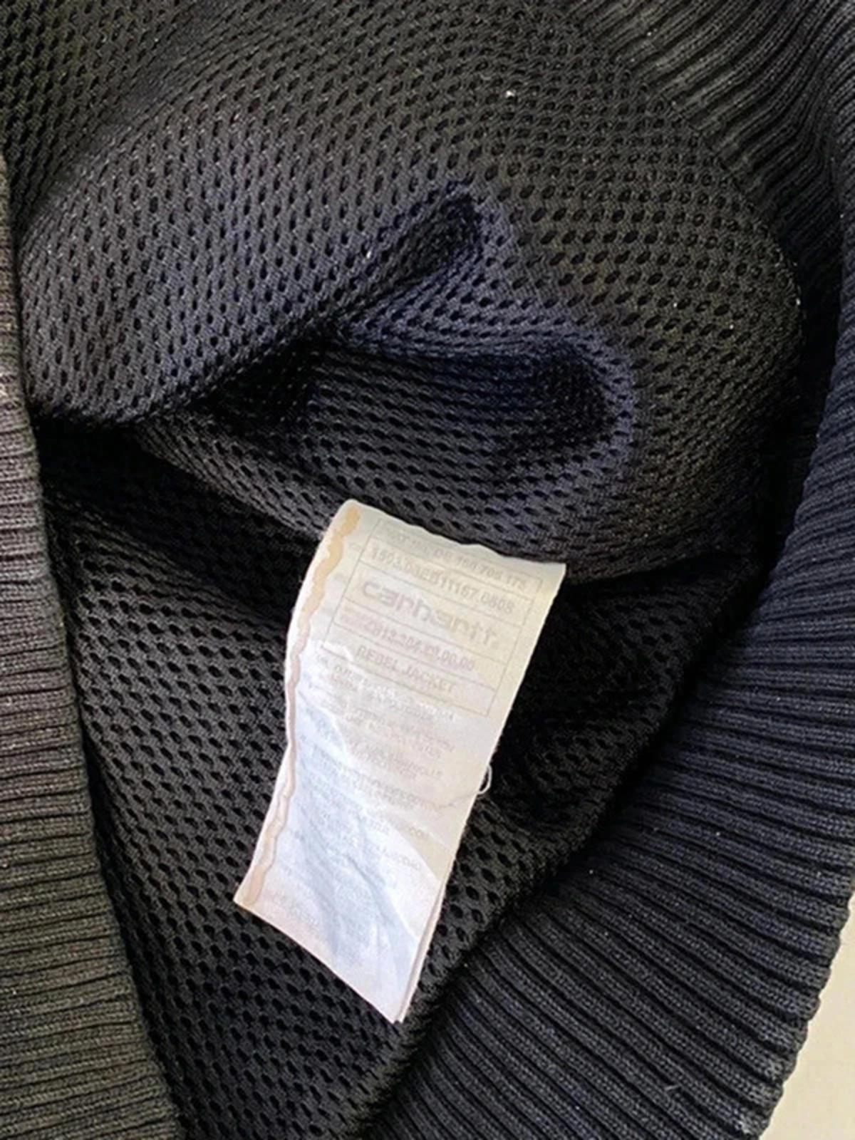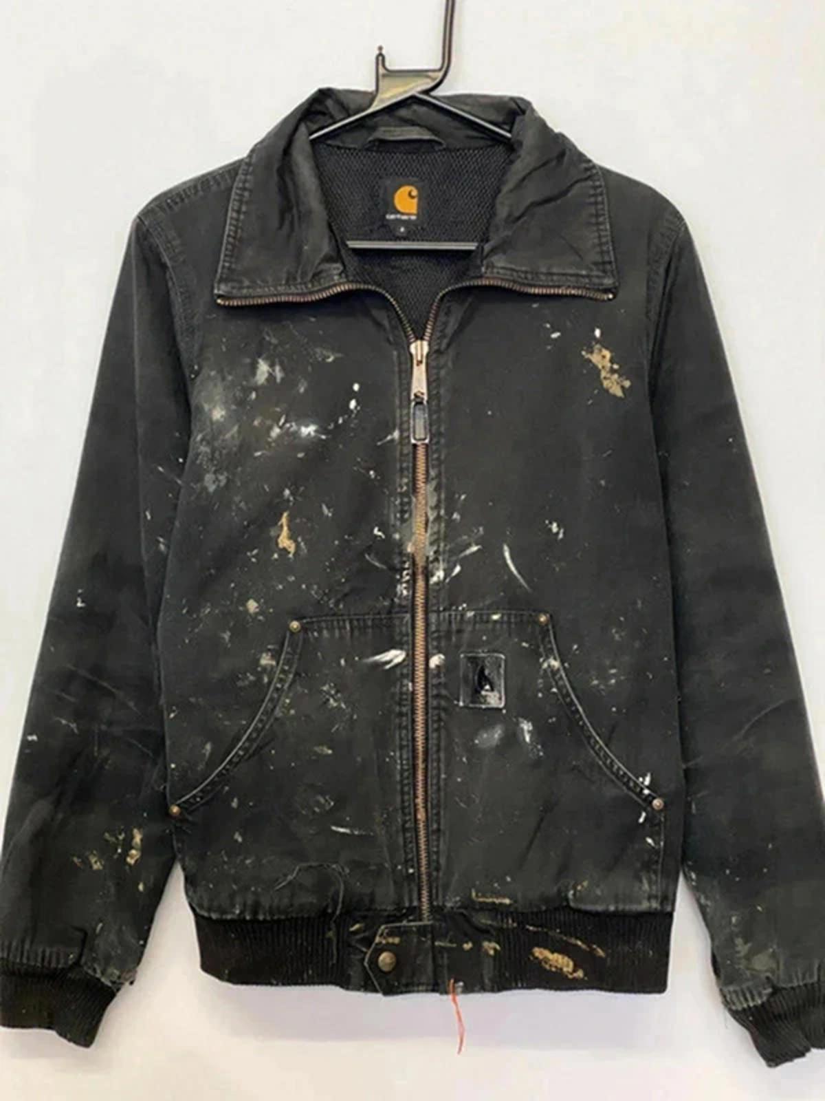 Durable Carhartt men's work jacket in black, featuring a full front zip closure and ribbed cuffs and hem for a snug fit. Constructed from heavy-duty fabric designed to withstand tough work environments. Two front pockets for convenient storage. Ideal for outdoor work or casual wear. Please note, the jacket shows signs of wear consistent with its use, adding character to this rugged piece.