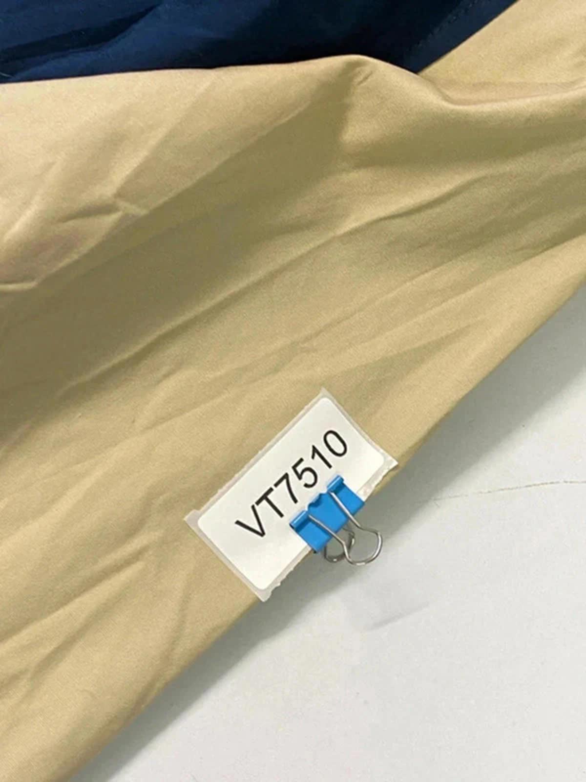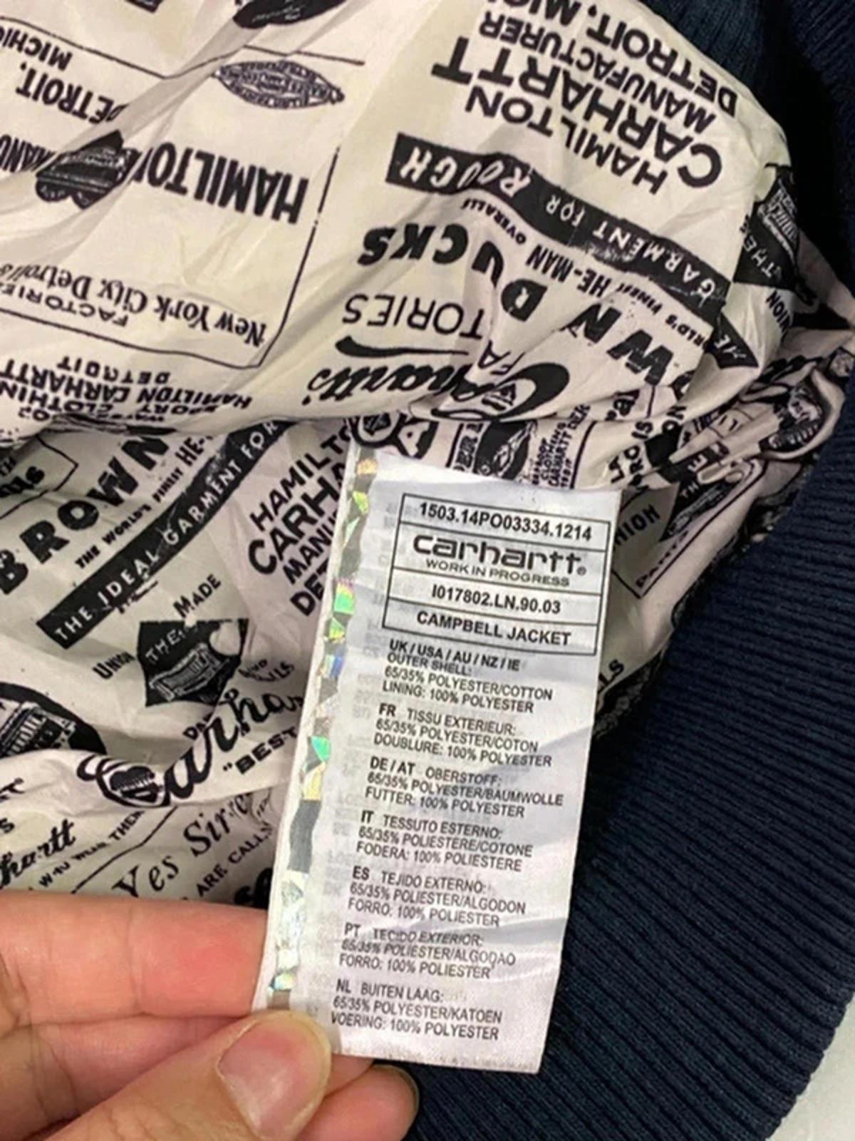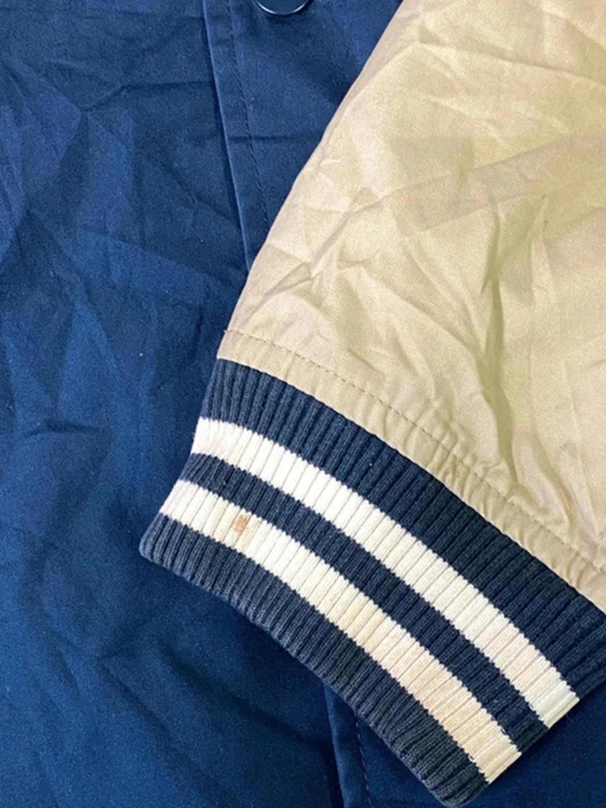 Durable Carhartt men's windbreaker jacket in navy blue with beige sleeves. Features a hood with adjustable drawstrings for added protection against the elements. Front button closure and striped ribbed cuffs and hem for a secure fit. Two front pockets with beige trim for convenient storage. Lightweight and perfect for transitional weather. Size: Large. Ideal for casual wear or outdoor activities.