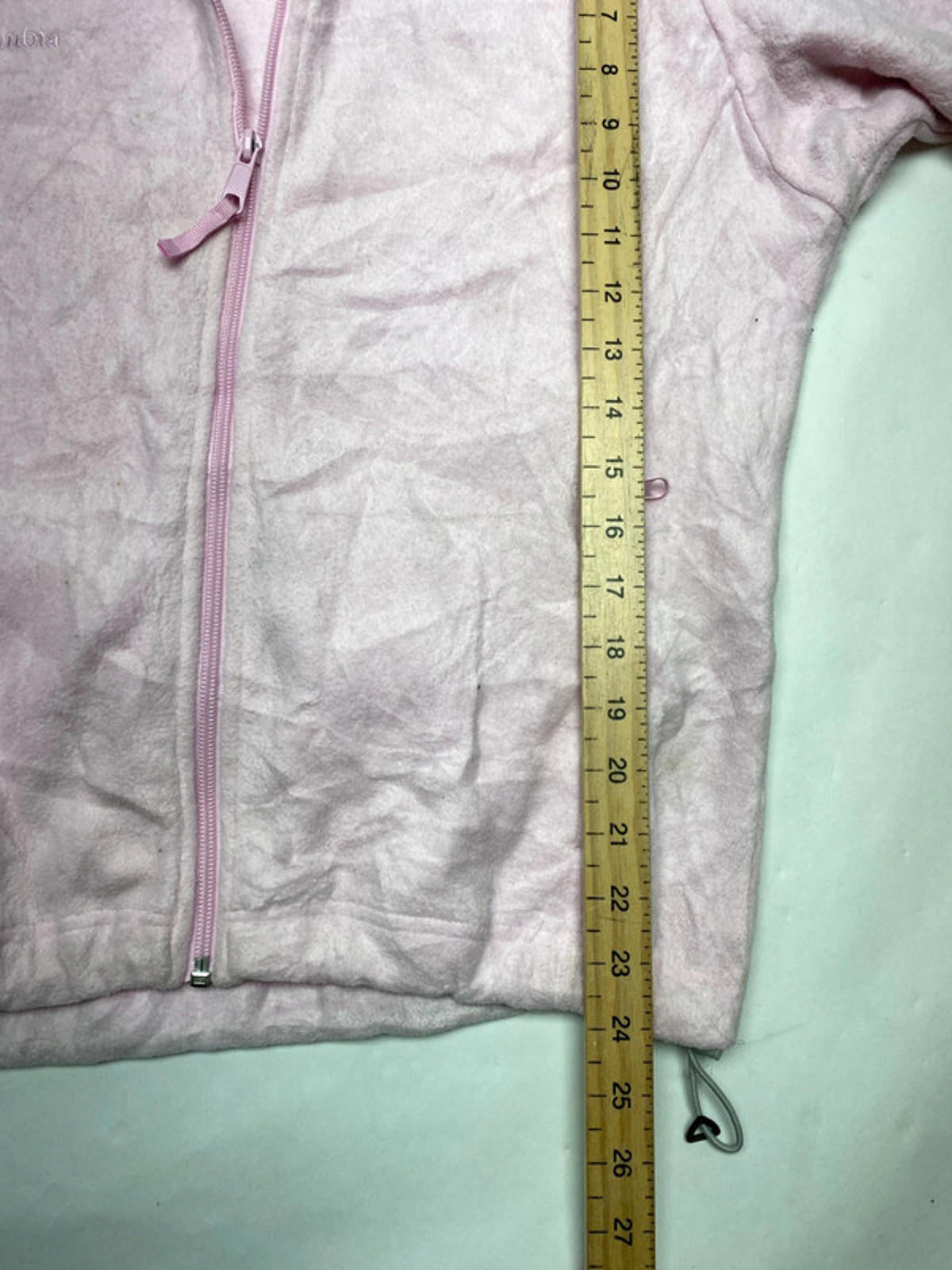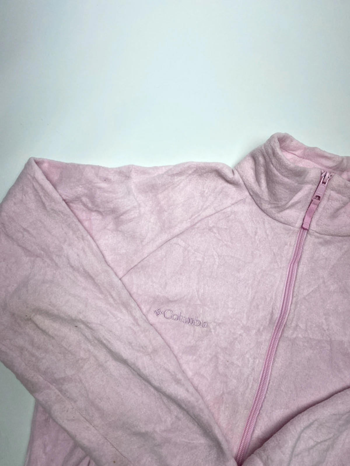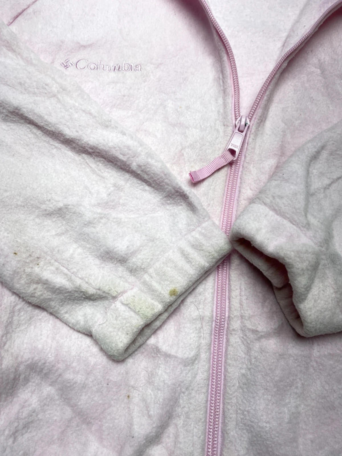 Soft and cozy Columbia Sportswear Company fleece jacket in light pastel pink. Features a full front zip, two side zip pockets, drawstring hem, and embroidered Columbia logo on the chest. Perfect for layering on outdoor walks, hikes, or casual wear. Size: Women’s M (Medium) Made in Vietnam Material: 100% polyester fleece Condition: Good pre-owned condition – some light wear and small marks consistent with use, but overall soft and warm.