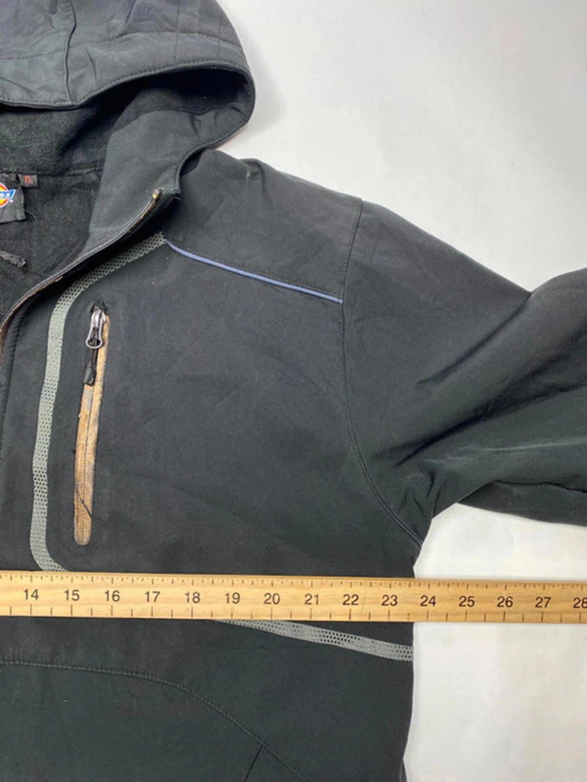 Men's utility jacket by Dickies in black colour. Features a full front zip closure and three zippered pockets for secure storage. Includes an attached hood for added protection against the elements. Durable fabric suitable for workwear or casual outerwear. Comfortable fit with adjustable drawstrings at the hem. Ideal for cooler weather and outdoor activities.