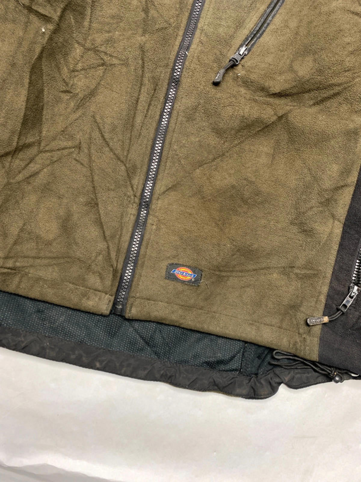 Classic Dickies workwear-style jacket featuring a durable olive shell with black contrast side panels. Full-zip front, three zip pockets (including chest pocket), elasticated cuffs, and subtle logo patch near the hem. Ideal for everyday wear, outdoor work, or casual vintage streetwear.