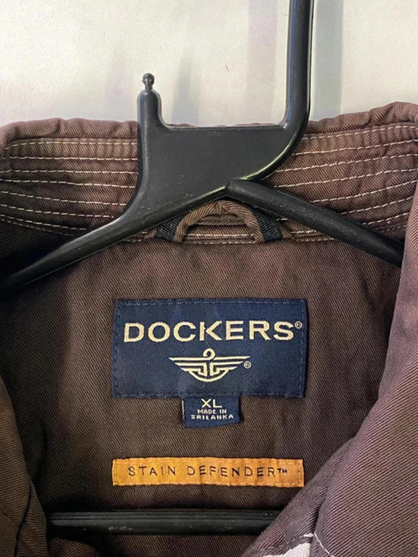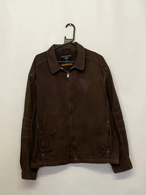 Classic Dockers zip-up jacket in a rich chocolate brown colour with contrast stitch detailing. Features a full front zip, spread collar, two front pockets, and ribbed inner cuffs. Part of Dockers' Stain Defender™ range – water and stain-resistant finish.