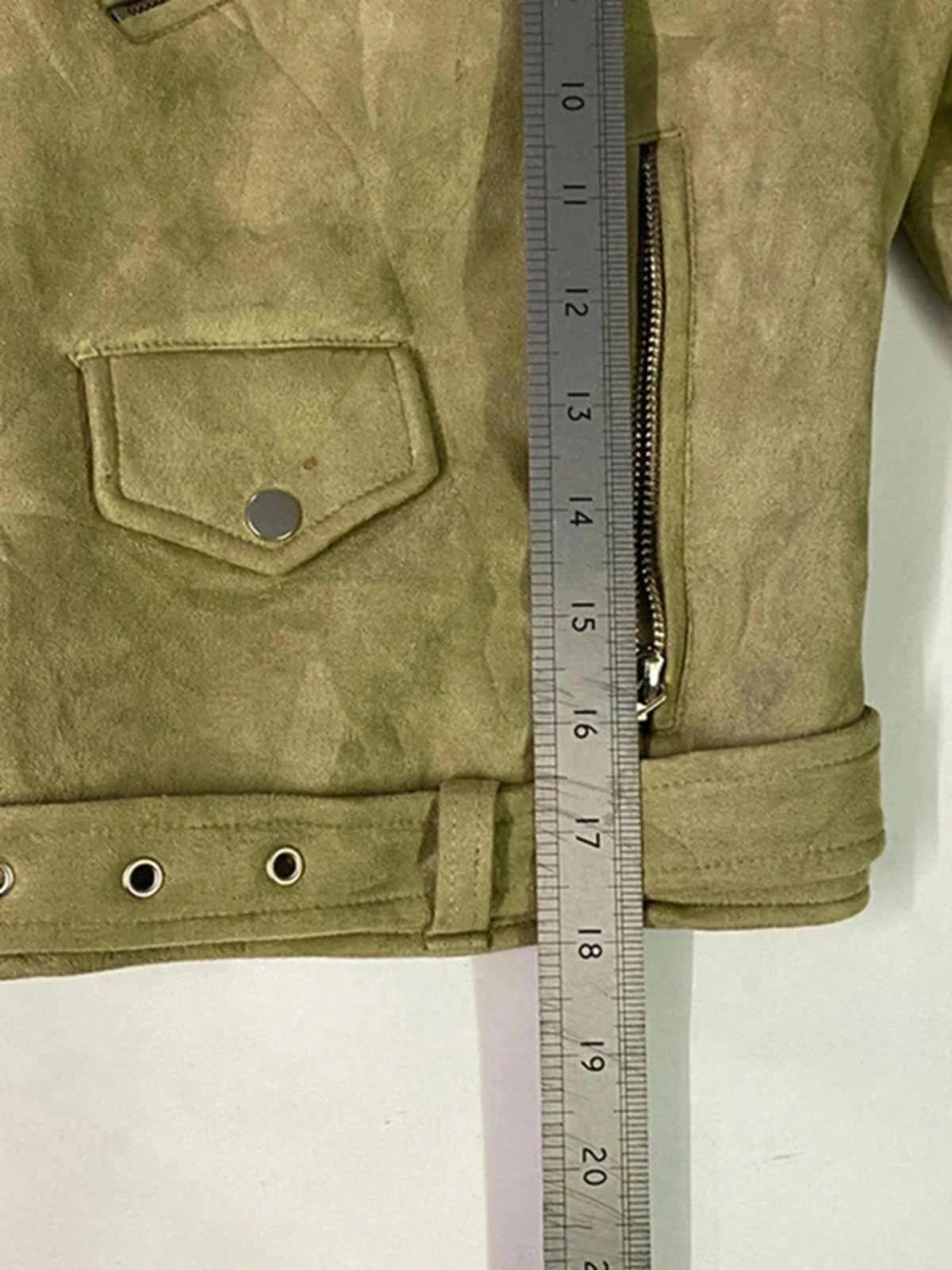 Stylish women's biker jacket by Lulu Love in a muted olive green suede. Features an asymmetrical zip closure, zippered pockets and a belted waist for a flattering fit. Epaulette detailing on shoulders adds a classic biker touch. Fully lined interior for comfort. Size Large, perfect for layering in cooler weather. A versatile outerwear piece combining edgy style with functional design.
