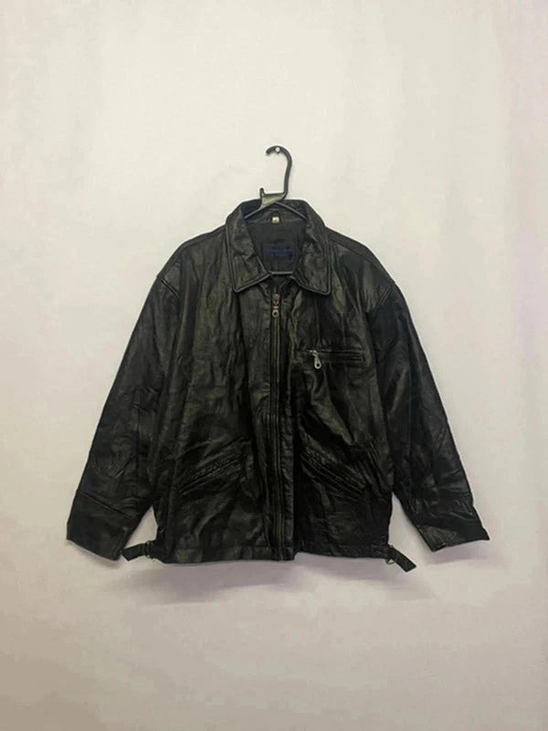 Vintage-style black faux leather jacket by Murphy, John & Daniel. Features a zip-up front, quilted inner lining, chest zip pocket, side pockets, and side buckle waist adjusters. • Size: XL • Condition: Good – light signs of wear throughout but no major flaws