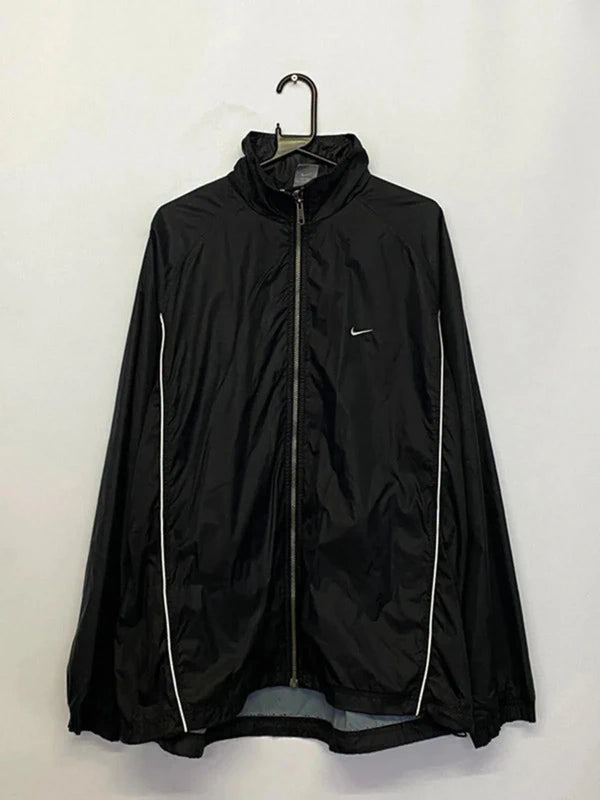 Lightweight black Nike windbreaker with subtle embroidered Swoosh logo and white piping along the sleeves. Breathable mesh lining, full front zip, and elastic cuffs. Perfect for running, layering, or everyday sporty styling. Tag reads size XXL – suitable for oversized streetwear look