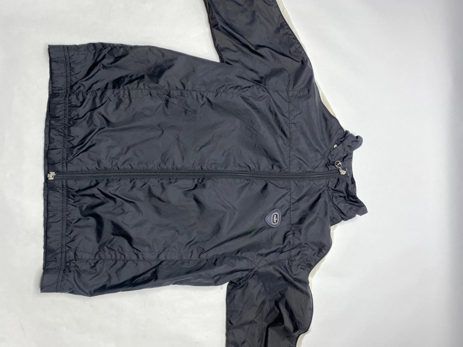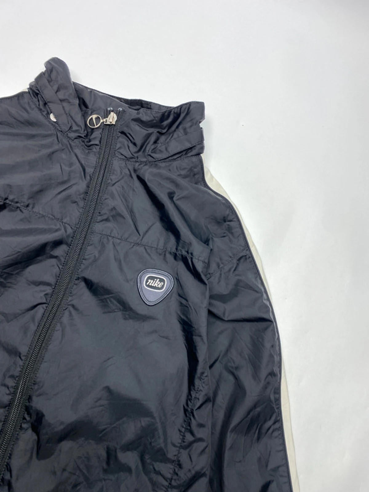 Stay comfortable and stylish with this Nike men's windbreaker jacket.\n\nFeatures a full front zip closure and a high collar for added protection against the wind.\n\nThe jacket is predominantly black with a contrasting white stripe running down the sleeves for a sporty look.\n\nLightweight and perfect for outdoor activities or casual wear.\n\nNike logo patch on the chest adds an authentic branded touch.