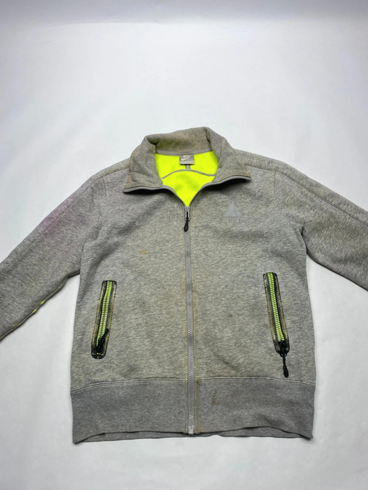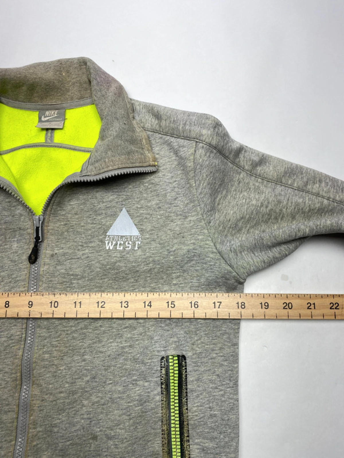 Warm and comfortable Nike Sportswear jacket featuring a soft neon-yellow fleece interior. Full-zip front, high collar, and two zippered pockets with textured neon detailing. Perfect for outdoor activities, running, or casual wear.