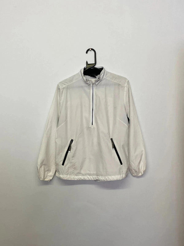 Nike lightweight half-zip windbreaker in white with black zip and trim details. Features a mesh inner lining, zippered side pockets, and elasticated cuffs. Ideal for running, training, or everyday streetwear. Size M (UK 8–10). In good condition with light signs of wear, typical for white fabric.