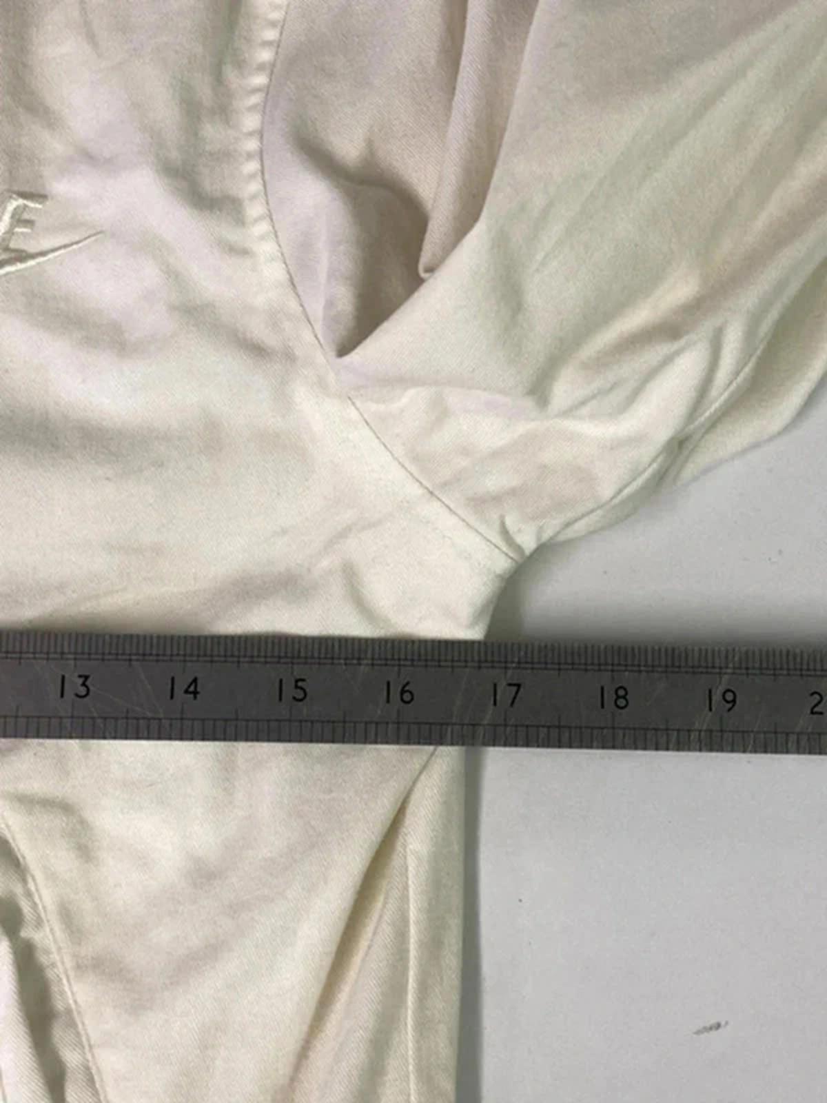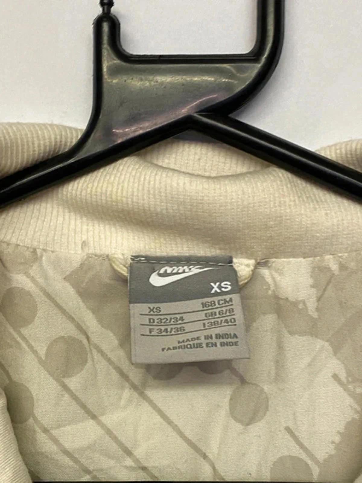 Nike women's lightweight jacket in white, size XS. Features a full zip front with snap button details on the collar and cuffs. Two front pockets and adjustable drawstring at the hem for a customised fit. Made from breathable material, suitable for casual wear or light outdoor activities.