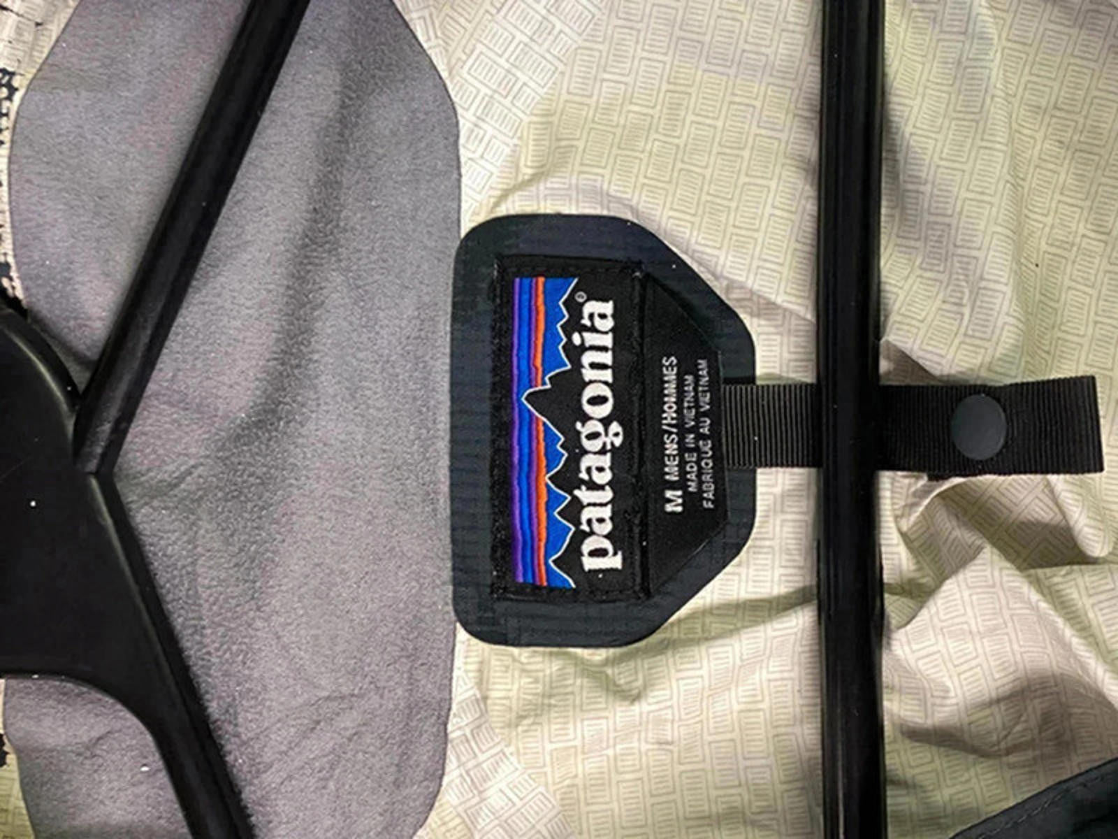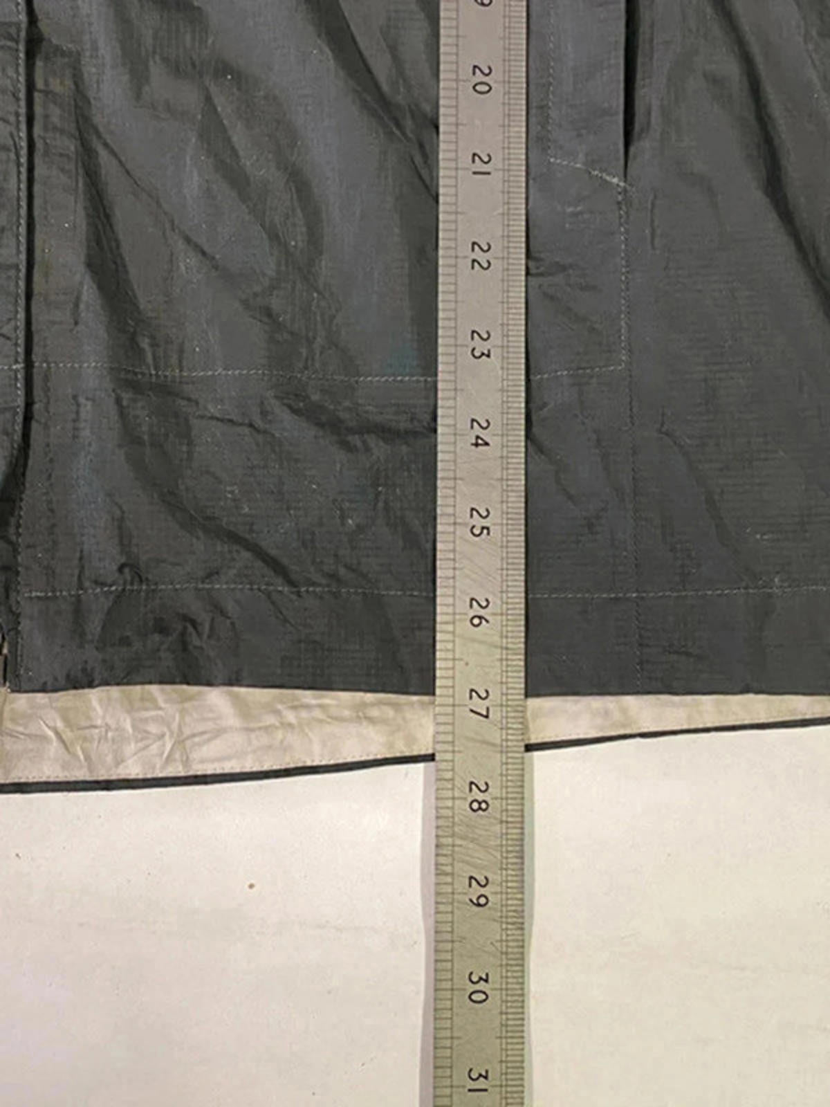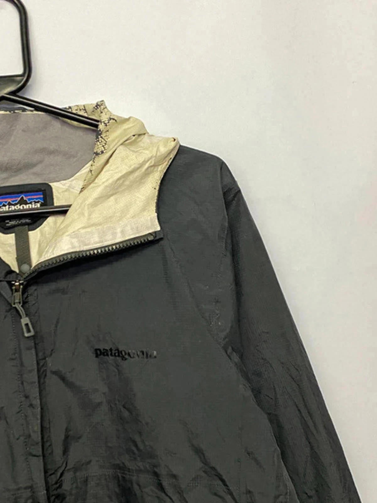 Lightweight and durable men's windbreaker jacket by Patagonia. Features a full front zip and adjustable hood for added protection against the elements. Two side pockets for convenient storage. Ideal for outdoor activities and casual wear. Classic black colour with contrasting beige hood lining. Well-maintained with minimal signs of use.