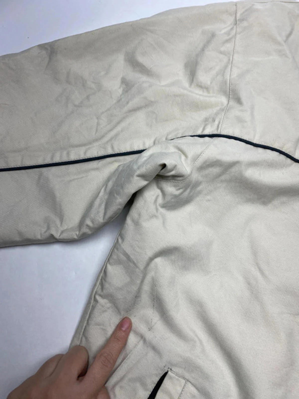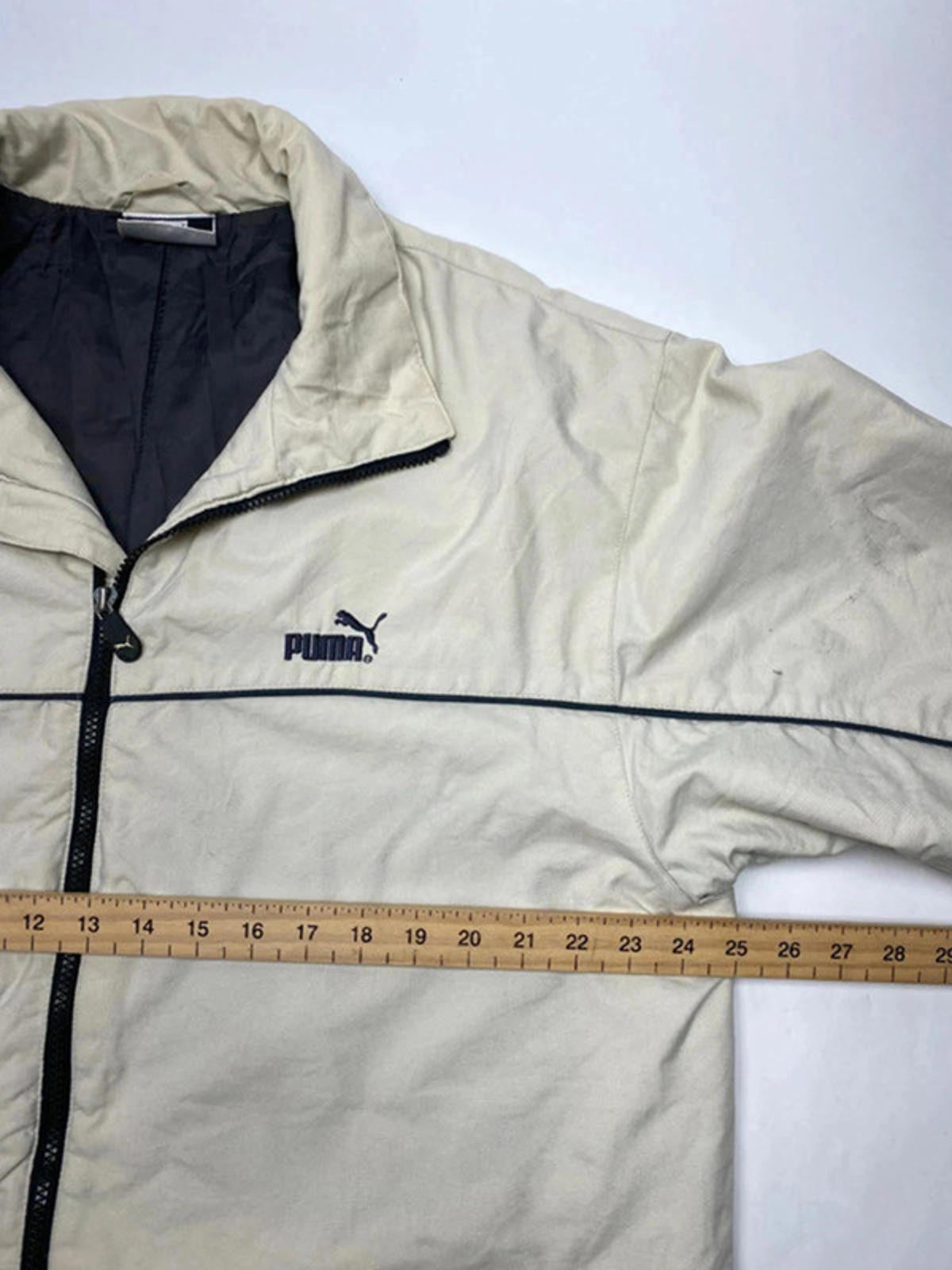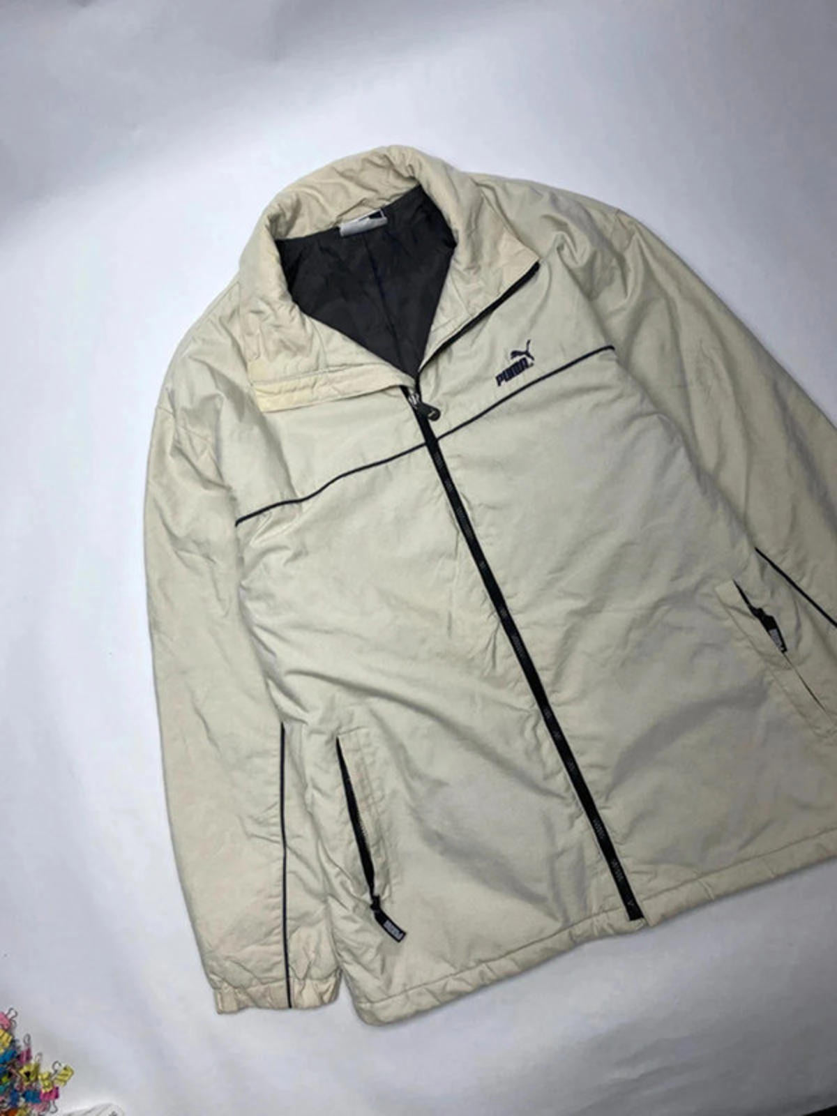 Classic vintage-style Puma padded jacket in beige with black piping details and chest logo. Features a full front zip, two zippered hand pockets, and elasticated cuffs. Lightweight insulation makes it perfect for transitional weather and everyday wear.