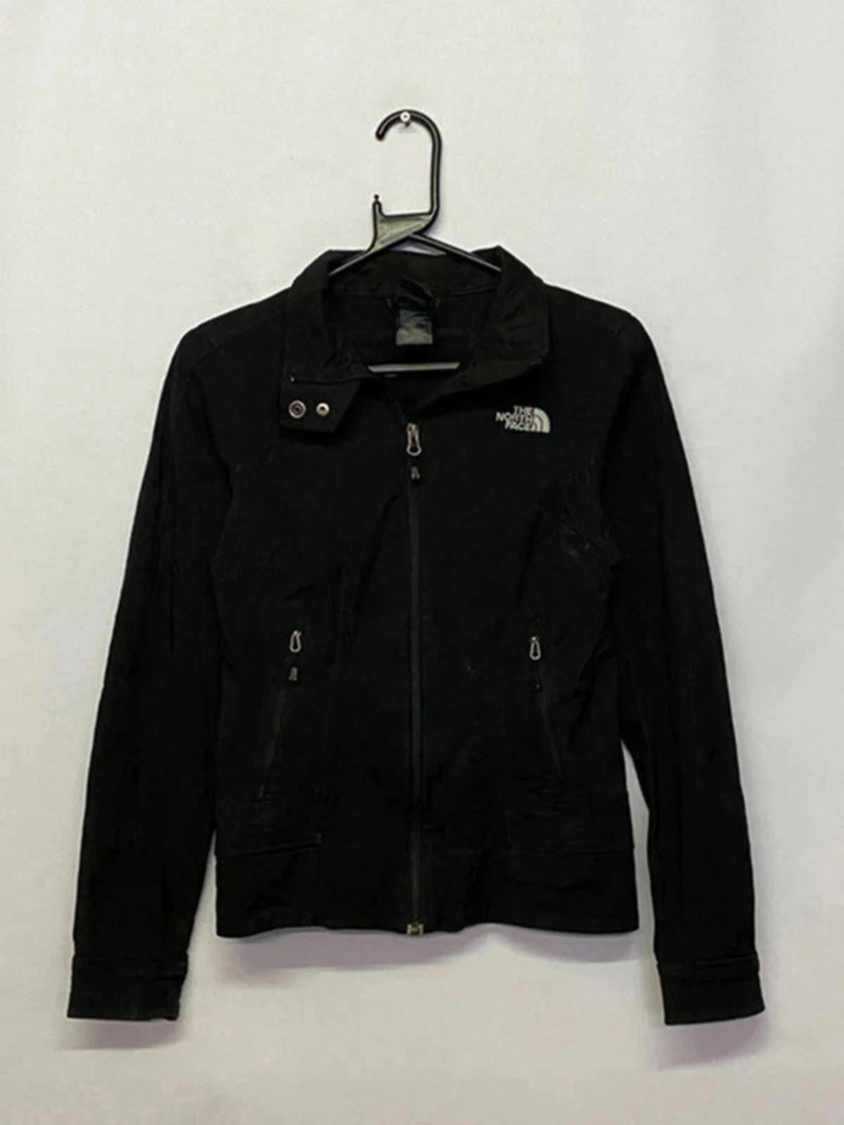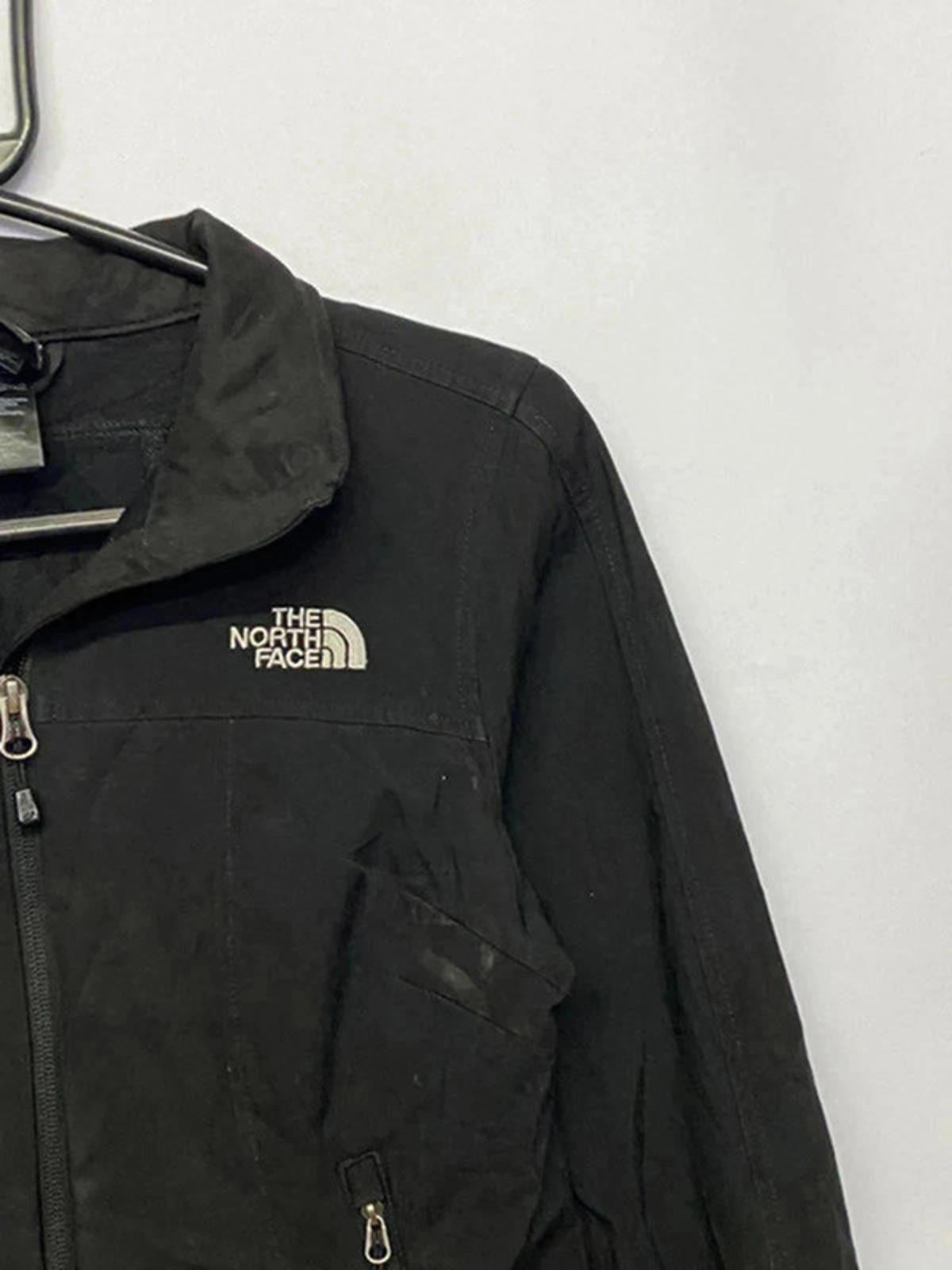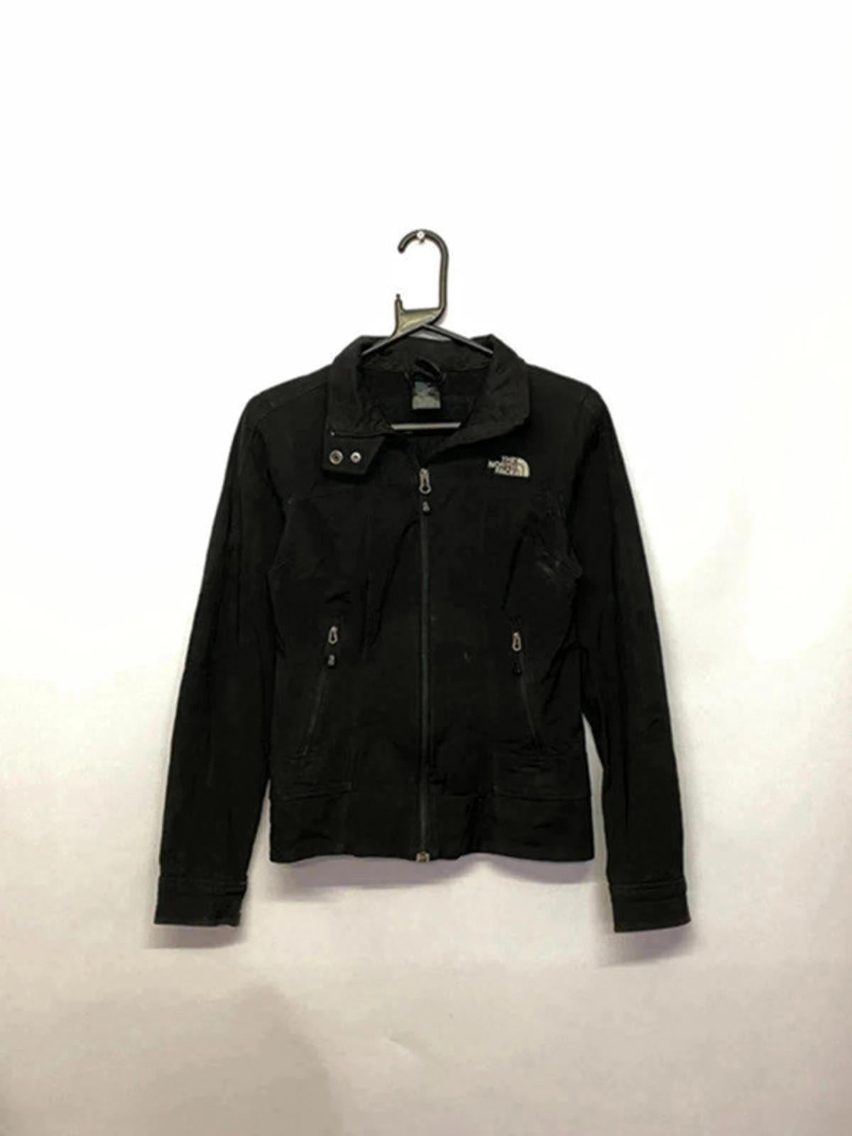 Men's black activewear jacket from The North Face featuring a full zip front and zippered pockets for secure storage. Crafted from durable, lightweight material suitable for outdoor activities and casual wear. Stand collar design provides additional wind protection. Ideal for layering or wearing alone in mild to cool weather. A versatile piece combining function and style for an active lifestyle.