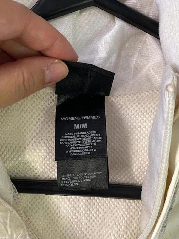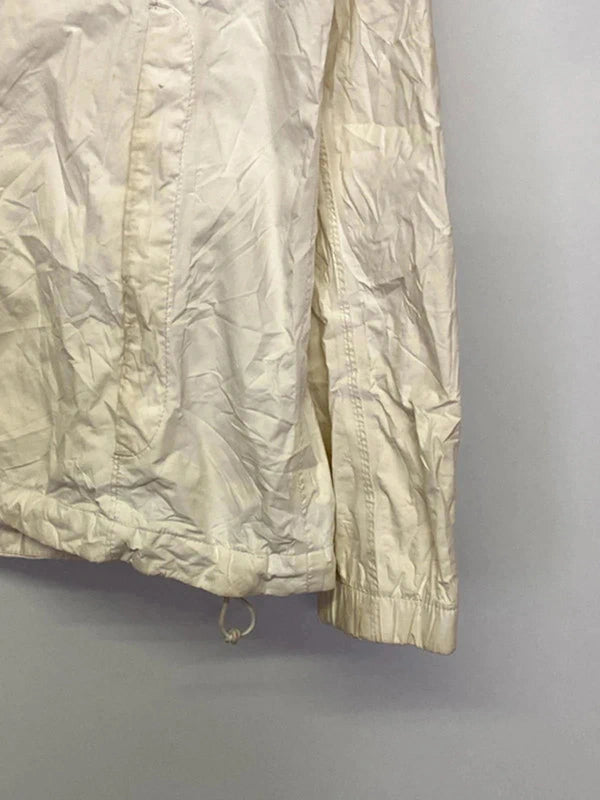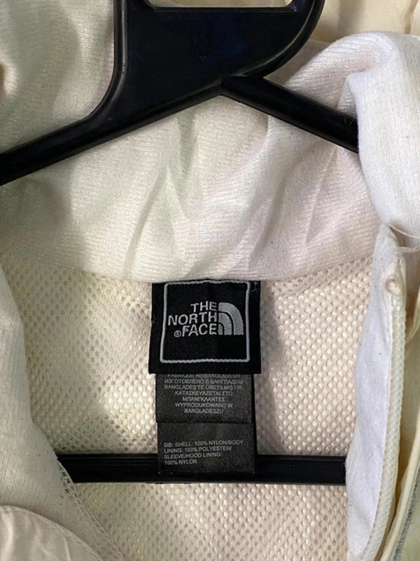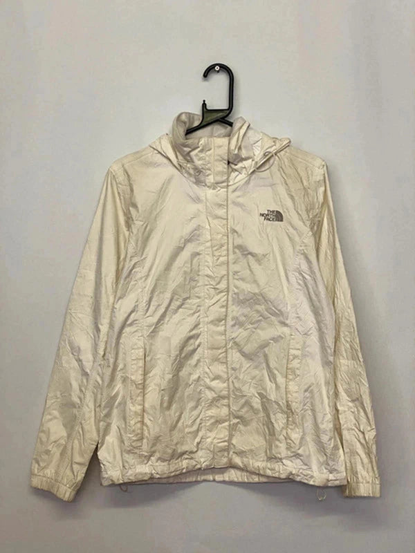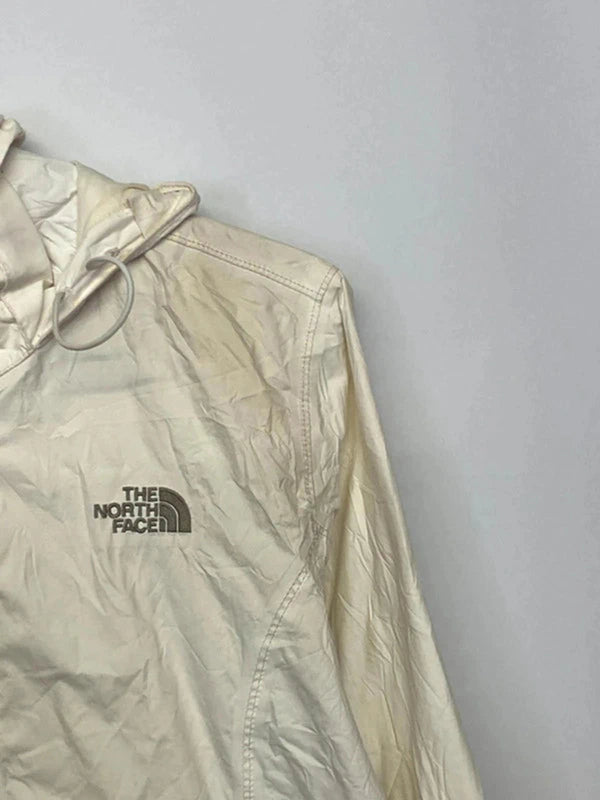 Light cream women’s The North Face shell jacket with full-zip and packable hood. Lightweight and breathable.