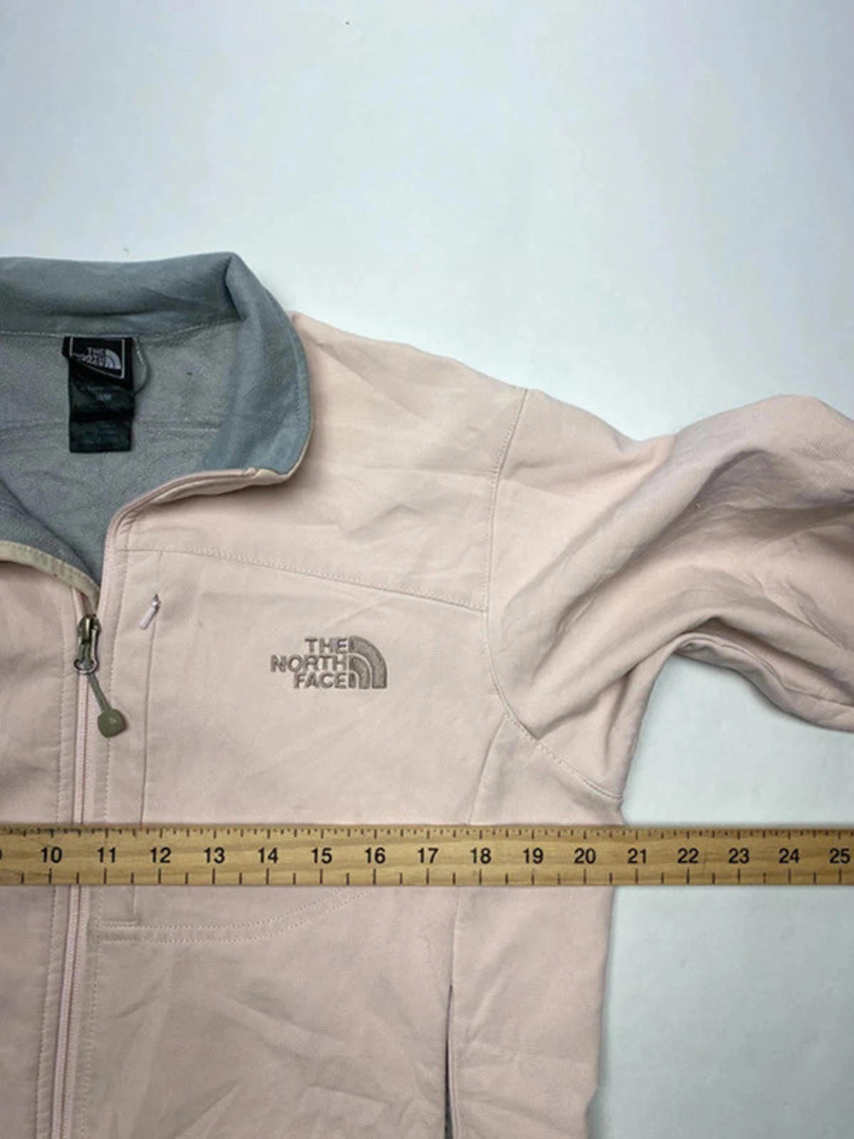 This women's fleece jacket by The North Face features a light pink outer shell with a contrasting grey inner lining and collar. It offers warmth and comfort with a full zip closure and side pockets for convenience.