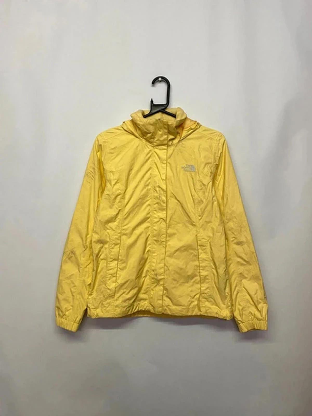 Lightweight and durable yellow windbreaker jacket from The North Face. Ideal for outdoor activities and casual wear. Features elasticated cuffs and a high collar for added protection against wind. Front zip closure with a flap for extra coverage. Perfect for layering during transitional weather. Please note: minor signs of wear present, consistent with previous use.